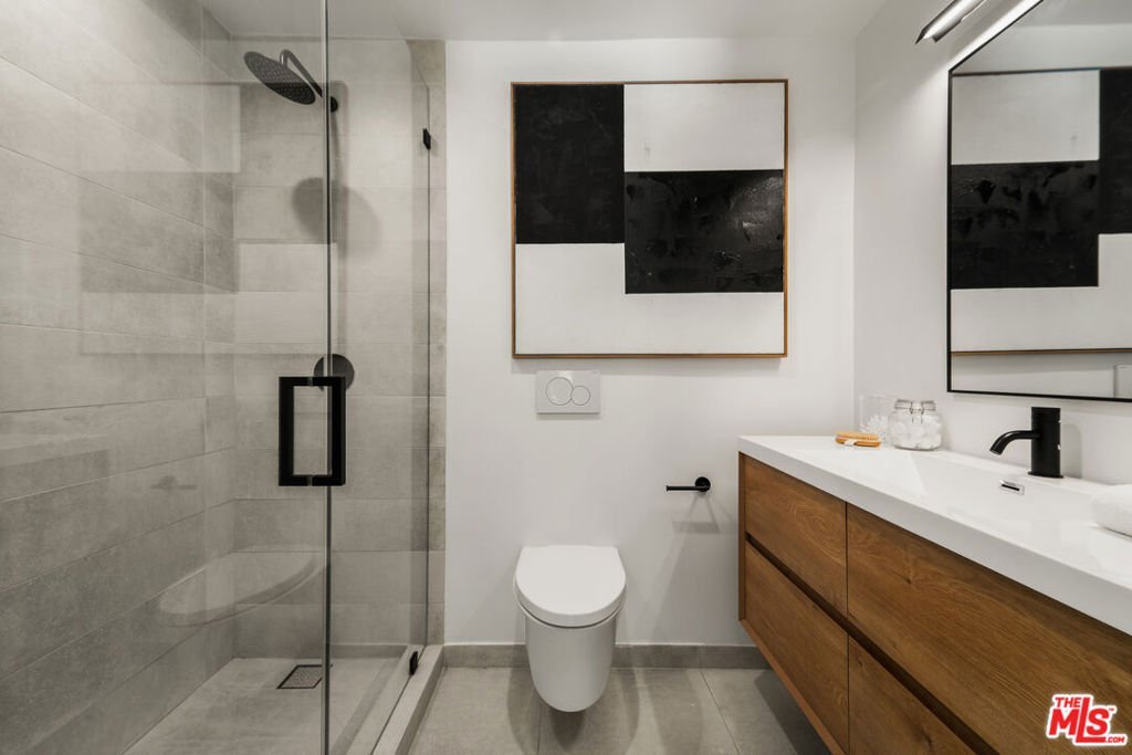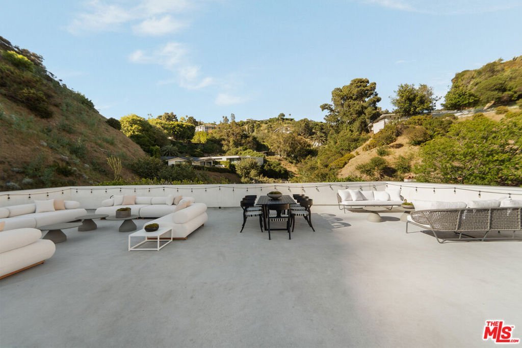 Meticulously renovated and masterfully reimagined, this exceptional modern residence in coveted Outpost Estates captures the essence of elevated Hollywood Hills living. Bathed in natural light, the main level features an expansive open-concept layout anchored by soaring 12-foot ceilings, seamlessly connecting the kitchen, dining, and living spaces--perfect for both refined entertaining and effortless everyday living. The chef's kitchen is a true showpiece, appointed with designer appliances, bespoke cabinetry, and striking Cosentino Dekton countertops. A chic powder room and a private guest suite with its own entrance complete the main floor, offering both versatility and comfort for visitors or extended stays. Upstairs, the stunning primary suite serves as a serene retreat, complete with direct access to one of two outdoor living spaces. Two additional en-suite bedrooms and a well-appointed laundry room complete the second level. At the pinnacle of the home, an expansive rooftop deck showcases sweeping canyon vistas and dazzling city-light views--an unforgettable backdrop for sunset gatherings or quiet evenings under the stars. A rare offering that seamlessly blends modern design, luxury finishes, and an unbeatable location.