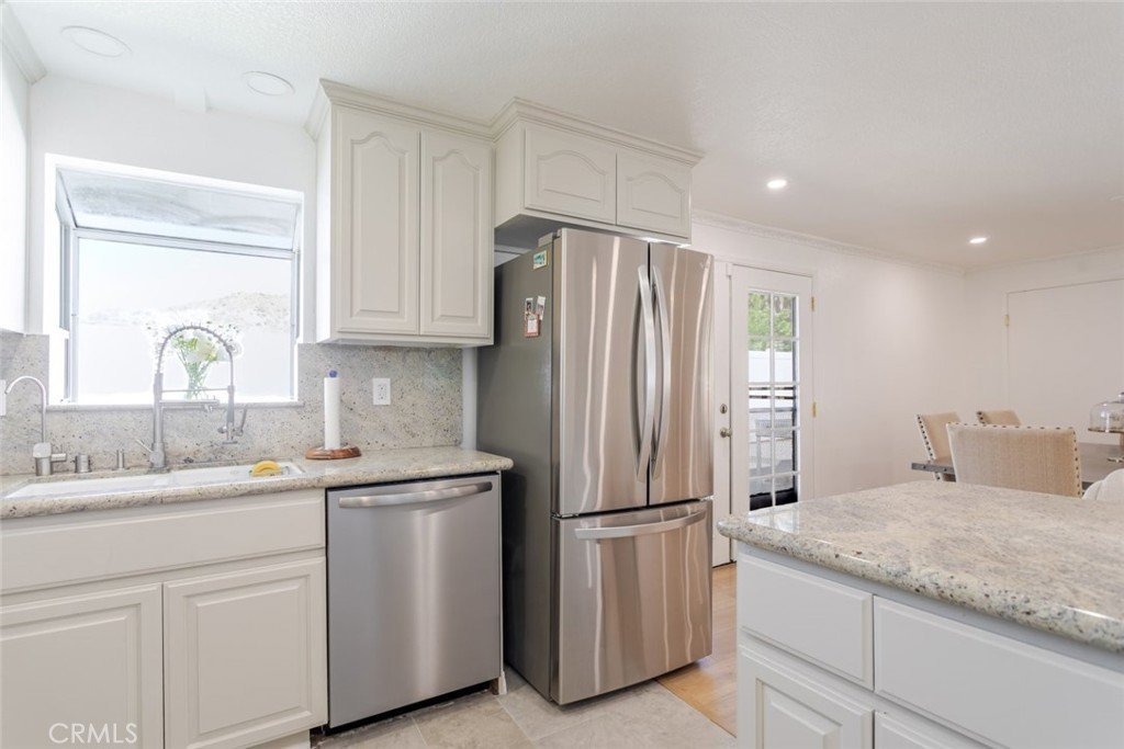 The open floor plan creates a seamless flow between the living, dining, and kitchen areas, ideal for both everyday living and entertaining. The living room features a cozy fireplace, beamed ceilings, and recessed lighting, adding warmth and character to the space. The kitchen is well-appointed with ample cabinetry, generous counter space, and included appliances.