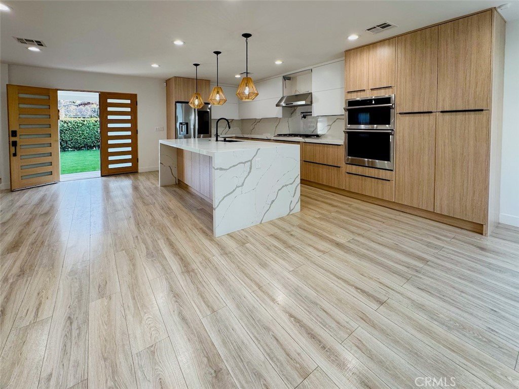 The light-filled open floor plan showcases skylights, recessed lighting, and modern finishes throughout. The chef’s kitchen features a large center island, quartz countertops, and stainless steel appliances—perfect for entertaining. Spacious bedrooms include custom closets, and designer bathrooms blend style and comfort.