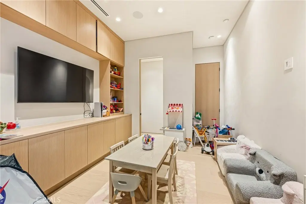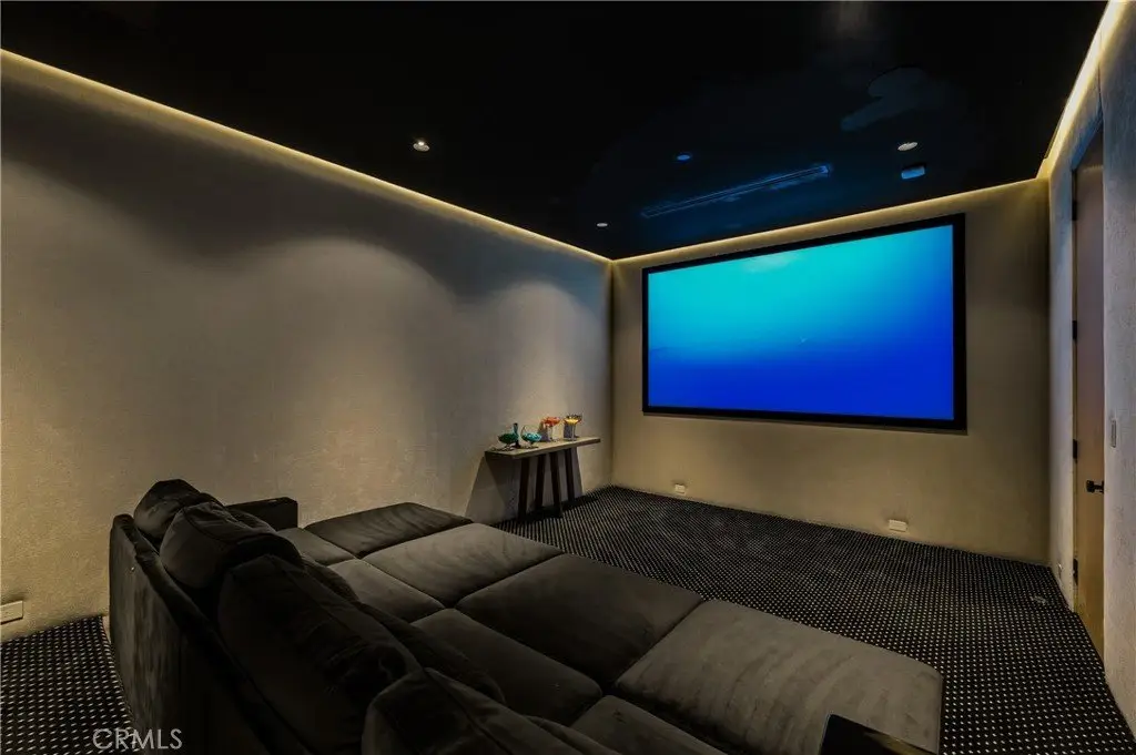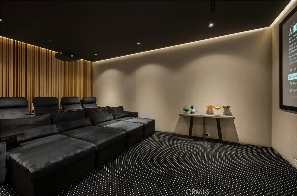 Entertainment reaches new heights with a private movie theater and a stunning outdoor environment. The cabana—with a full outdoor kitchen and BBQ—is ideal for hosting or relaxing. Car enthusiasts will appreciate the 13.6-ft RV garage with hookups, the attached two-car garage, and an additional two-car garage in the backyard. An electric automatic pocket door offers seamless access to the outdoor spaces.