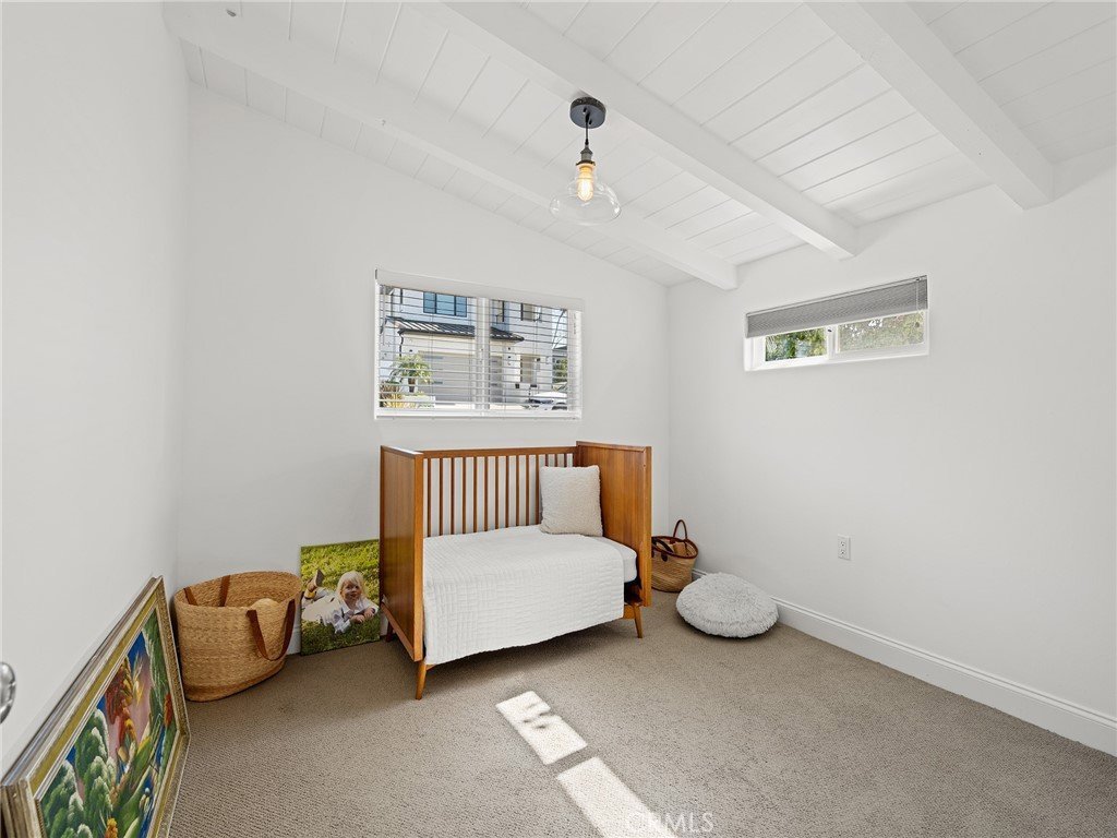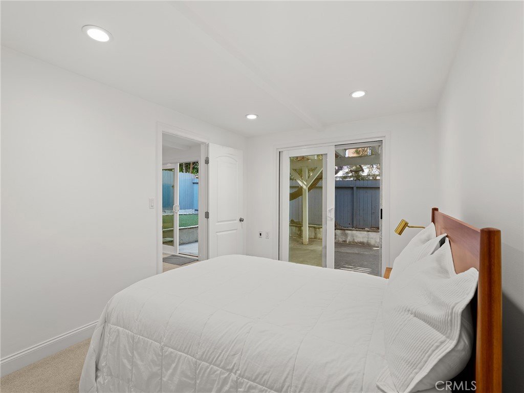 California coastal street presence with a bright, mid century modern interior. The main level features a vaulted ceiling great room with exposed beams, wood floors, and abundant natural light. An open layout connects the living area to the kitchen and dining space, where large glass windows and doors frame the rear deck and yard, creating a strong indoor outdoor connection. The kitchen and dining area include bar seating and direct access to the outdoor deck for easy entertaining.