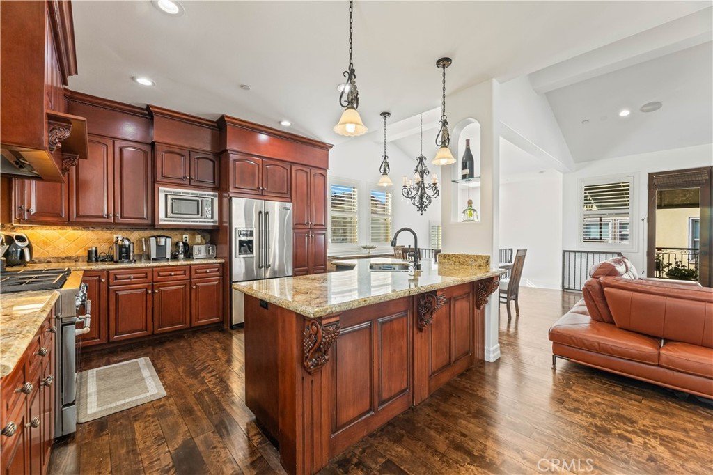 Moving upstairs, the home opens into an expansive great room with soaring cathedral ceilings, rich hardwood floors, custom plantation shutters, and a cozy fireplace. French doors lead to a large covered patio, creating a natural extension of the living area and an ideal spot for morning coffee or evening conversations. The adjoining dining area flows effortlessly into the gourmet kitchen with granite countertops, custom cabinetry, stainless-steel Jenn-Air appliances, and a built-in wine rack—perfect for gathering, cooking, and entertaining.