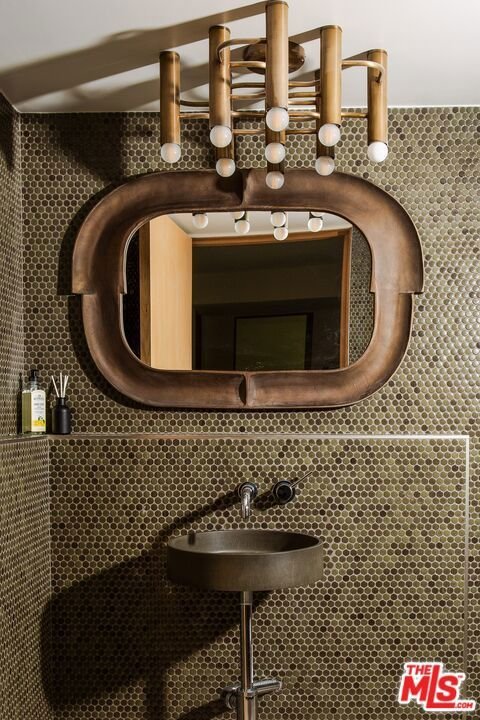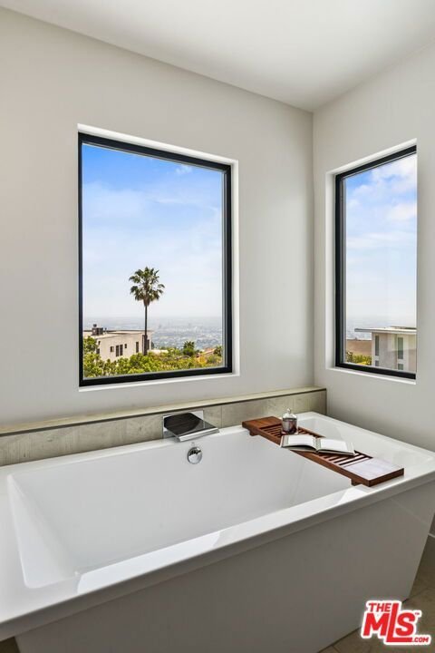 Thoughtfully reimagined by Devall Design Home, this five-bedroom, five-bathroom retreat blends timeless style with seamless indoor-outdoor living in the Hollywood Hills. Expansive views stretch from Downtown to Catalina Island, while an open layout invites effortless entertaining. Highlights include a living space centered around a living tree, a dramatic curved staircase, custom bar, and designer lighting. The chef's kitchen features a full suite of Miele appliances and a built-in coffee bar. Floor-to-ceiling Fleetwood windows and doors flood the home with natural light. Outdoors, an oversized pool, kitchen, and fireplace extend the living space. Three bedrooms offer en-suite baths and private outdoor areas. Just moments from the Sunset Strip and set within a secure community with 24/7 patrol, this home balances privacy with prime access to dining and entertainment.