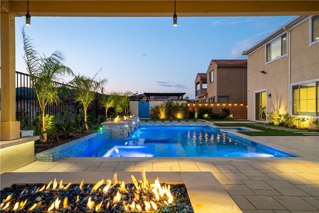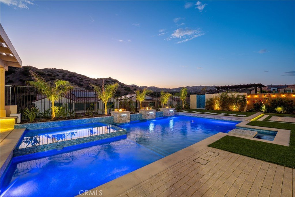 The resort-inspired backyard is designed to eliminating the need for a getaway, bringing the vacation experience home. Enjoy the pool, spa, and jacuzzi, outdoor shower with hot water, and a fully equipped poolside bar and BBQ station with commercial dishwasher and stone countertops. A fire pit with built-in seating, multiple patio areas, and panoramic hills and canyon views create an exceptional setting for gatherings or quiet evenings outdoors.