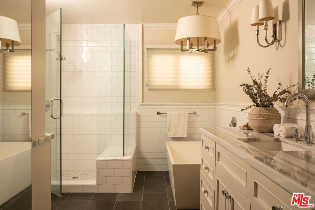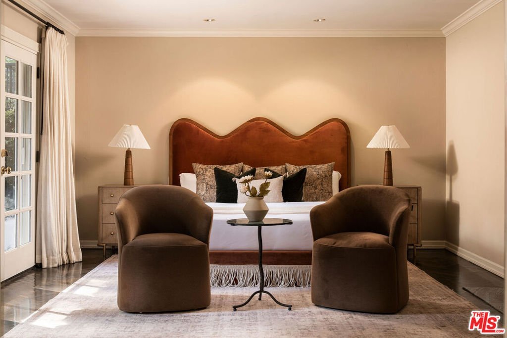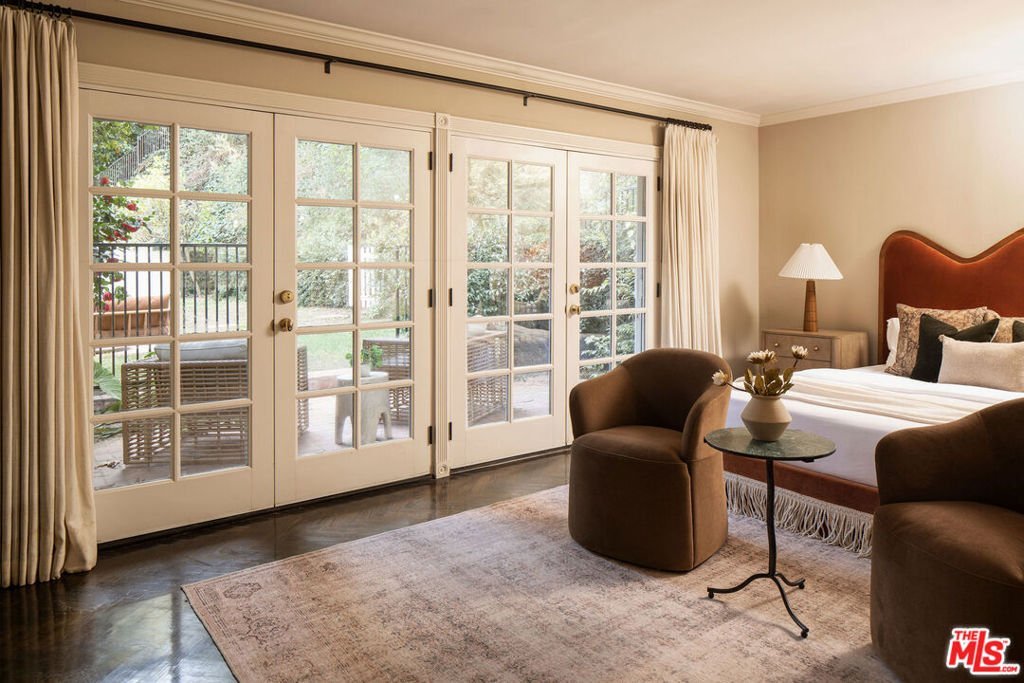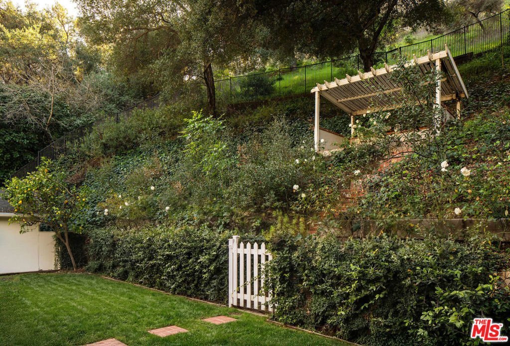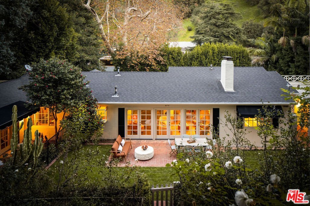Hidden from the street behind gates and towering 50-foot privacy hedges, this pristinely updated storybook traditional haven promises a charm-filled lifestyle amidst peace and serenity, with three bedrooms + den. A vast circular motor court wraps around the grassy front lawn and leads to the home's exposed-brick entry, its reddish hue complemented by the freshly painted creamy white facade. Inside, fantastic newly refinished dark hardwood floors impressively shine, reflecting natural sunlight welcomed by large picture windows. A bank of French doors lines the formal living room, with its elegant fireplace and dry bar/tasting area. The country kitchen includes a butcher-block island with wine refrigeration, comfy breakfast nook, open shelving, copious cabinetry, farm sink, period tin ceiling, and state-of-the-art stainless-steel appliances. Restored original wainscoting in the adjacent formal dining room adds classic prestige to intimate dinner parties. The primary wing, a true prize of the home, is equipped with a double-door entry, French doors to the backyard, fireplace, built-ins, and a versatile antechamber with a built-in desk, perfect as a television room, office, lounge, nursery, and more. The en-suite spa-inspired bath is complete with radiant floor heating, a glass-enclosed shower and separate oversized tub, subway tile wraparound, and massive department-store-like changing wardrobe with custom organizers, dresser island, makeup desk, and a safe for securing valuables. The guest bedroom is also warm and inviting and features a third fireplace and bath with shower. Outside, dine al-fresco and converse with friends and family surrounded by lush plant life. Or, retreat past terraced rose gardens for calm reflection from a trellis-covered patio, perched above the quaint grounds with delightful views of various treetops and natural ridge line. A detached guest house includes a wet bar, side-by-side laundry, doggy door, and three-quarter bath. In addition to the abundance of storage and deep closets found throughout the home, there is also a bonus storage shed. Parking is for eight to ten vehicles plus a two-car garage. Lovingly updated with modern finishes and gorgeous garden views from every room, this beautiful hidden jewel is move-in-ready and awaits its next chapter. Discover why this ideal location is dubbed Celebrity Row, cherished and private yet just moments to Rodeo Drive and the Westside. Welcome home!