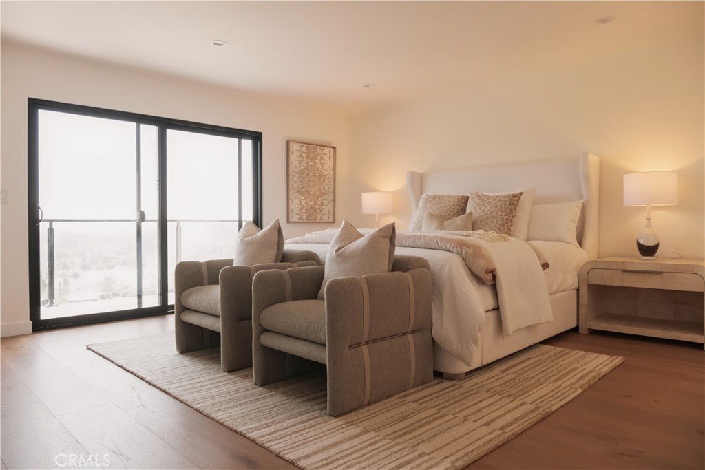 The main level centers around a chef’s kitchen outfitted with Thermador appliances and custom oak cabinetry, opening to a generous dining and living area anchored by a modern fireplace and integrated oak built-ins. A separate family room adds flexible space for work, play, or quiet relaxation. On the lower level, the primary suite offers a true retreat with a spa-style soaking tub overlooking the hills, dual walk-in closets, and direct access to a continuous view patio shared by two additional en-suite bedrooms. The entertainment level below is designed for hosting — complete with a full bar lounge, fourth en-suite bedroom, and a spacious deck ideal for al fresco evenings beneath the stars. With its private entrance, this floor can double as a guest residence, studio, or private suite, complemented by a bonus room perfect for a gym, theater, or playroom.