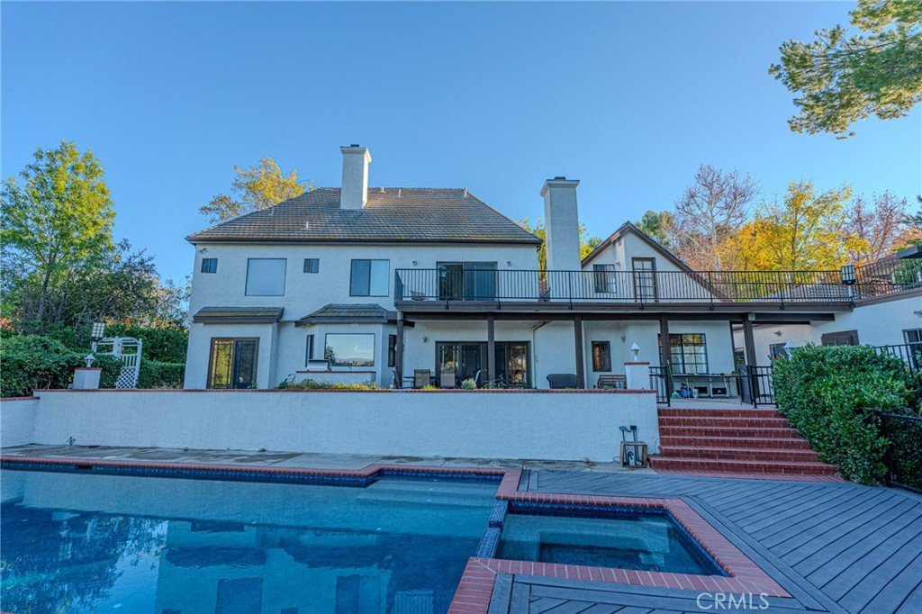 Welcome to your dream home located in the high desired Valencia Vista Hills Community, this custom refreshed Tudor Style 5,300 sqft home offers a perfect blend of luxury, comfort, and functionality. Experience the timeless charm of this home, featuring exquisite original woodwork and hardwood floors throughout. Embrace the perfect blend of historic elegance and modern comfort. A formal entry way sets an elegant tone with beautiful high ceilings, and a spacious open layout, easily accessible for those with ADA needs. The heart of the home is the expansive kitchen with large windows that allow natural light to highlight the space, while seamlessly flowing to the family room which is impressed with coffered ceilings, adding elegance for gatherings and celebrations. The adjacent dining room and living room features one of this homes’ eye-catching gas fireplaces, offering warmth and livability. The home features two convenient downstairs bedrooms each with fully remodeled bathrooms, leading to thoughtfully designed living spaces flexible for office space or guest rooms, enhanced by fresh interior paint. Another two generous upstairs bedrooms, a master suite and a versatile bonus room/theater room. The private primary suite is a true sanctuary with it’s own fireplace, two walk-in closets and a spa-inspired bathtub, a separate shower and access to outdoor deck for a morning coffee or stargazing at nights. As an intimate extension of the living space, there is an additional wing suite with its own private stairway entrance, direct access to an outside large roof top deck with picturesque views including the community golf course in your own backyard. Multiple sets of French doors connect to the private backyard retreat, accessible from the dining room, and family room. Enjoy a recently refinished pool and deck. In addition, you will find 5 total garage parking spaces with a separate oversized 2-car tandem garage that can also be used for a golf cart, utility vehicles or workshop. All brand new elegant Clopay style garage doors. Located in a quiet cul-de-sac to add additional privacy, surrounded by excellent schools, shopping centers, dining, freeway access, outdoor recreational areas, low HOA fees and no Mello-Roos. Valencia Hills HOA amenities feature: Clubhouse, Pickleball courts, tennis courts, community pools, playgrounds, and golf course. This beautiful one-of-a-kind home will bring many lasting memories to be treasured for years to come!
