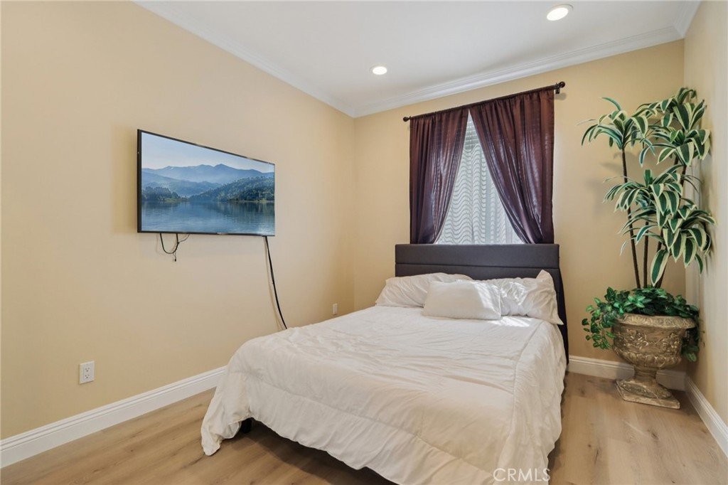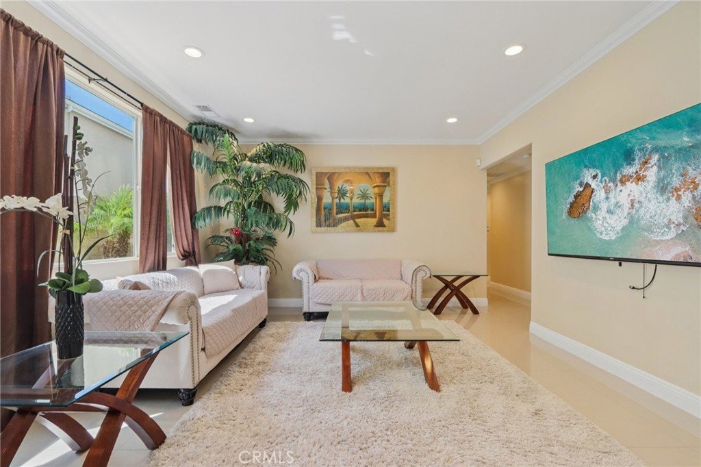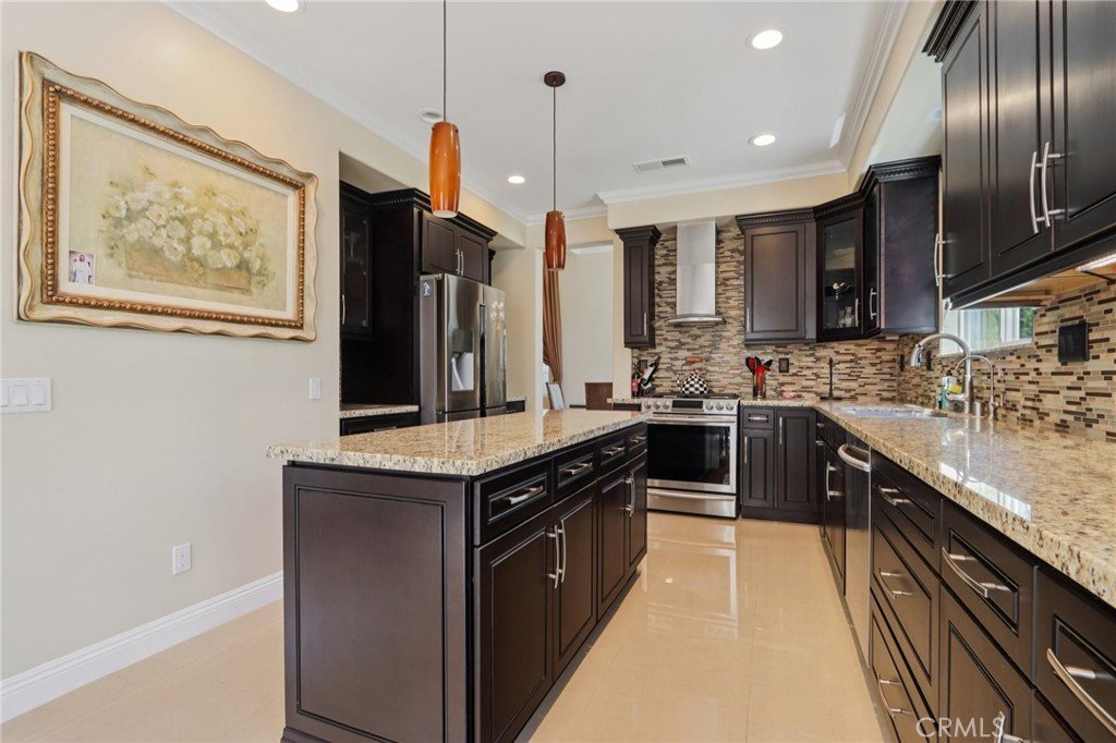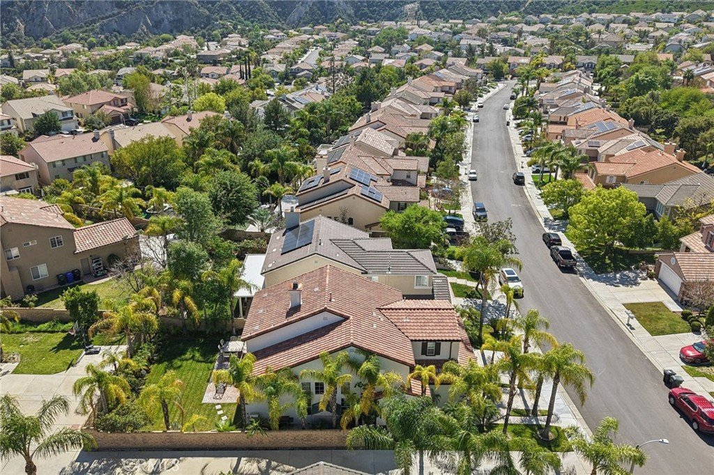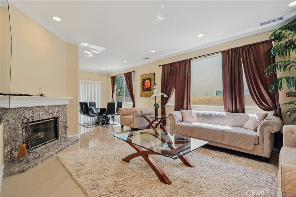 Stunning two-story home in desirable Stevenson Ranch featuring 4 bedrooms and 3 bathrooms, including a convenient downstairs bedroom and full bath. Offering approximately 2,698 sq ft of living space on a 5,656 sq ft lot, this beautifully remodeled home (2017) showcases a custom wrought iron entry door, high-gloss porcelain flooring, recessed lighting, and a formal living room with cathedral ceilings. The gourmet kitchen features a center island, granite countertops, custom cabinetry, and opens to the family room with fireplace and sliding glass doors leading to a landscaped backyard. Upstairs offers laminate wood flooring throughout, a bright primary suite with walk-in closet, and a spacious bathroom with dual sinks and walk-in shower. Secondary bedrooms are generously sized with ample closet space. Additional features include a separate laundry room with top-of-the-line washer and dryer, a security alarm system, and an attached 3-car garage with tiled flooring, built-in workstation, and automatic car lift.