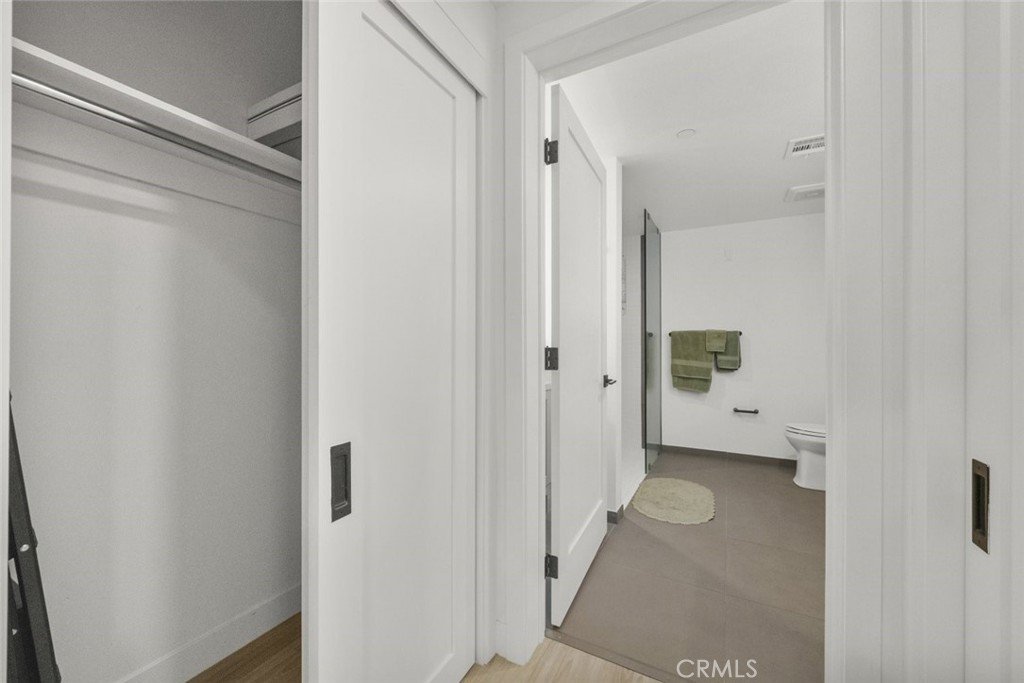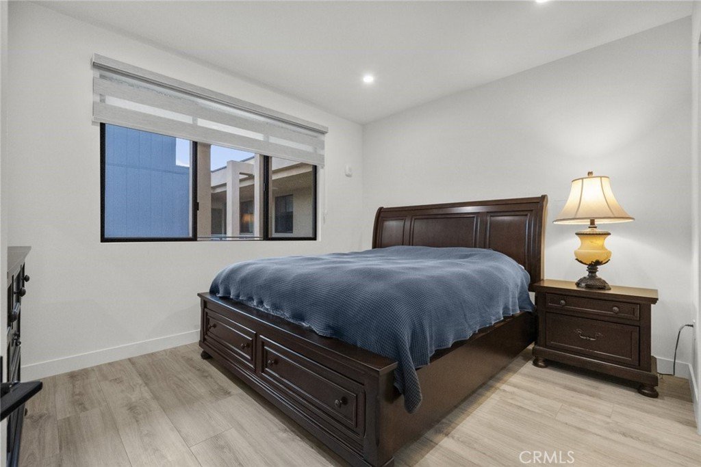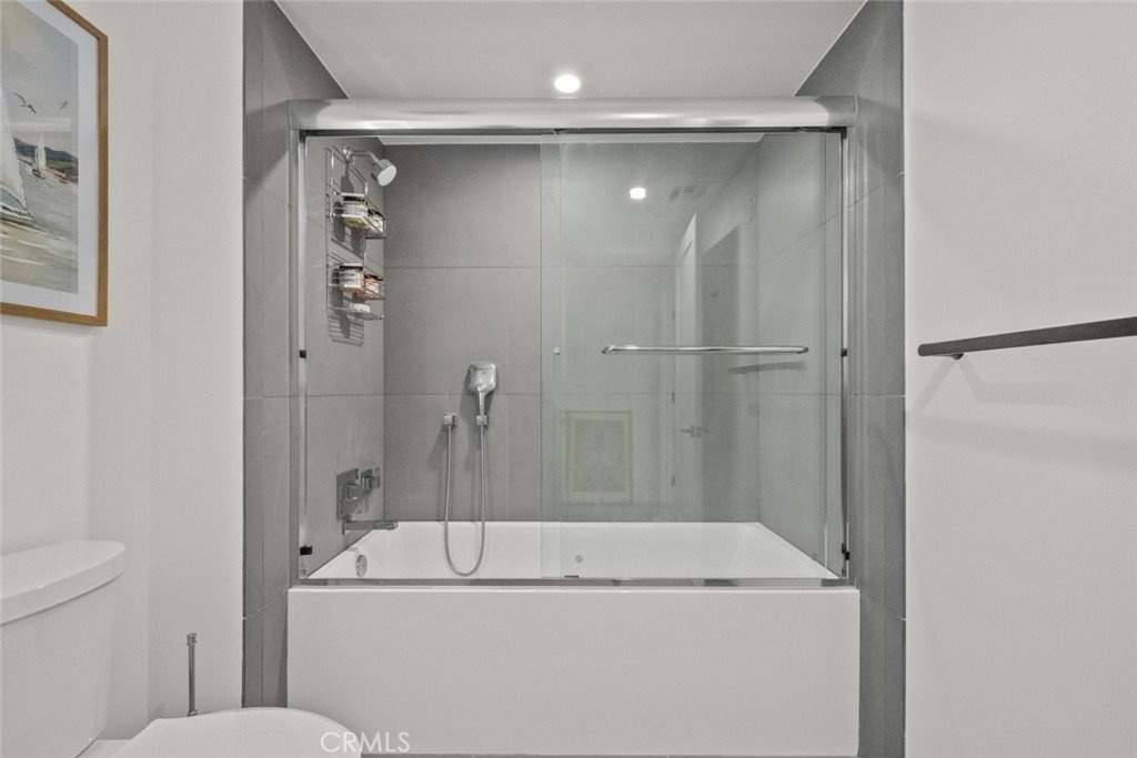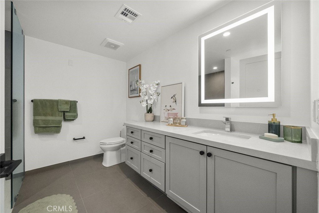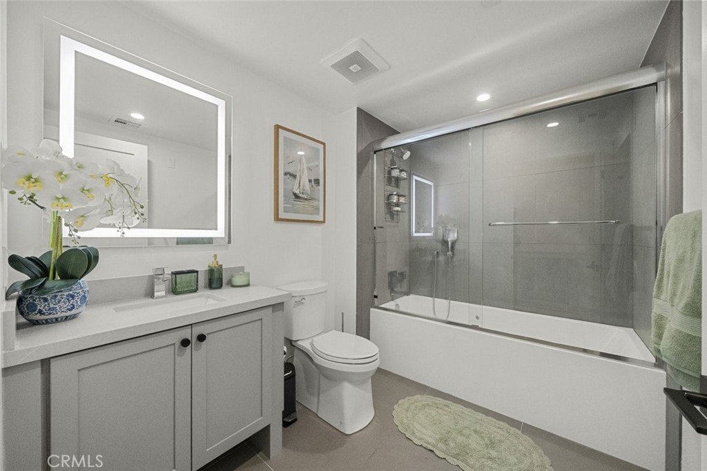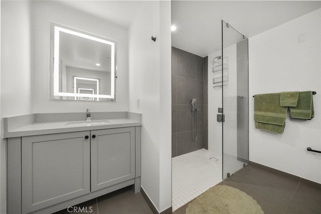 The primary bedroom features ample closet space and an ensuite bathroom with a dual sink vanity and contemporary finishes. The secondary bedroom is well sized and conveniently located near the second full bathroom, which includes a spacious shower and modern design.