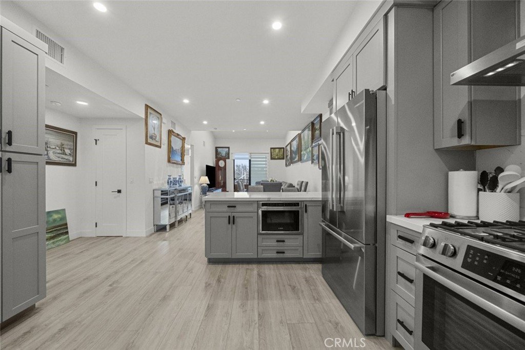 The modern kitchen offers clean lined cabinetry, stainless steel appliances, quartz countertops, and a generous center island that connects seamlessly to the living and dining areas, creating a comfortable space for daily living and entertaining. The open living area extends to a private balcony with neighborhood and hillside views.