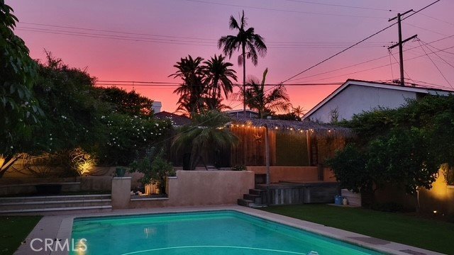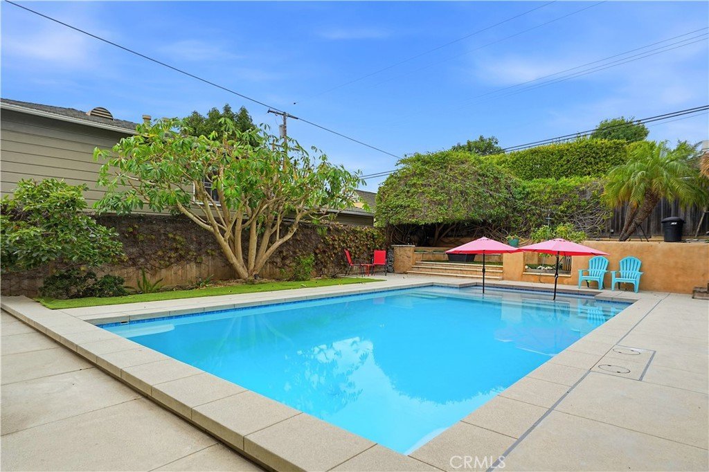 Mid-Century Modern retreat in the heart of Belmont Heights! This beautifully designed home blends timeless architecture with effortless California living. The open floor plan offers distinct living, dining, and casual spaces — all centered around a dramatic fireplace and framed by large doors that open to the gorgeous backyard. The outdoor space is pure paradise. Recently remodeled, the sparkling pool features a Baja shelf for lounging in the sun. Surrounded by lush greenery, fruit trees, and a spacious lawn, this resort-style yard also includes a cozy fire pit, a tropical palapa, and multiple areas to relax or entertain — the perfect setting for weekend gatherings or peaceful evenings under the stars. Inside, light pours through oversized windows, highlighting high ceilings and gleaming wood floors. The chef's kitchen features stone counters, stainless appliances and a charming breakfast area overlooking the pool. The main level offers multiple living areas, a generous bedroom with vaulted ceilings and a renovated full bath — ideal for guests, a home office, or multi-generational living. Upstairs, you’ll find three additional bedrooms, including two that share a stylish Jack-and-Jill bath. The primary suite is truly a retreat — spacious enough for a sitting area, also with vaulted ceiling, dramatic windows and featuring a gorgeous updated en suite primary bath with a dual vanity, luxurious walk-in shower and a glimpse of the ocean beyond. The fully finished basement provides even more versatility — great space for an in-home gym, a studio, workshop or playroom — with direct access to the attached two-car garage that offers an additional storage room. Located just a short stroll from local schools, parks, restaurants, and the beach, this exceptional home combines comfort, style, and an unbeatable Belmont Heights lifestyle.