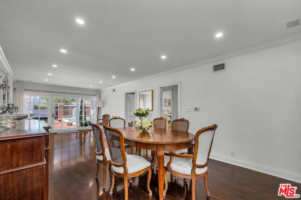This two bedroom two bath beauty is flooded with light and offers perfect indoor/outdoor living. The spacious living room, overlooking the front yard, has a fireplace and white oak floors. Matching white oak flooring flows throughout, leading to a generous dining room and open den, ideal for large dinner parties! Both spa-inspired bathrooms have been tastefully remodeled with Perrin & Rowe fixtures and elegant Italian porcelain tile. One features a luxurious soaking spa tub, while the other offers an oversized shower with built-in seating. The kitchen features a six burner gas cooktop and ample storage. Additional highlights include central air conditioning and built-in Bose speakers.Step outside the den into a serene backyard oasis with a brick patio, sparkling swimmer's pool, and tranquil fountain ideal for relaxing or hosting guests. The garage, enhanced with French doors, has been transformed into a versatile bonus space, complete with a laundry area and extra storage. Situated in a prime central Westside location, this home is just moments from popular dining, Trader Joe's, The Expo Line, major freeways, UCLA, and Century City. Located within the sought-after Clover Avenue School District, this is a rare opportunity not to be missed!