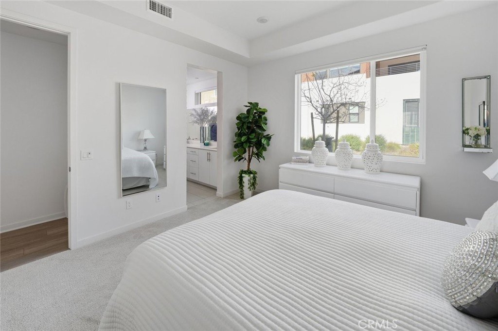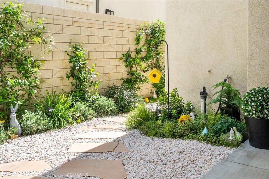 Absolutely stunning and rare 3 bed, 2 bath ground floor SINGLE STORY home in the highly sought after Rowan collection in Valencia's coveted FivePoint community. Beautifully appointed modern home featuring an open-concept floor plan with high ceilings, large picture windows, luxury vinyl plank flooring, and tons of designer upgrades. Can be purchased fully furnished! Step inside to the large living room bathed in natural light with views of the lovely courtyard through the oversized picture windows. The bright and airy living area flows seamlessly into the dining space featuring a beautiful feature wall and eye-catching chandelier. The gourmet kitchen is an entertainer's dream, showcasing quartz countertops, a huge island, designer backsplash, beautiful white cabinetry with brushed nickel hardware, a walk-in pantry, and high end stainless-steel appliances. From the kitchen, step through sliding glass doors to the charming and spacious covered courtyard - perfect for relaxing or outdoor get togethers. The primary suite offers plush carpeting, recessed lighting, custom window coverings, a generous walk-in closet, and a luxurious en-suite bathroom with dual quartz vanities and a walk-in shower. Two additional bedrooms include large closets, custom window coverings and abundant natural light. The full guest bath also features dual vanities, quartz counters, and a tub/shower combination. Additional highlights include a dedicated laundry room, attached two-car garage, and owned solar panels for enhanced energy efficiency. Residents of the FivePoint community enjoy resort-style amenities such as multiple pools, spas, cabanas, parks, walking trails, a recreation center, dog park, community garden, and a popular Sunday Farmer’s Market. Conveniently located near shopping, dining, and the 5 Freeway yet tucked away in a quiet community, this exceptional residence offers the perfect blend of elegance, comfort and convenience.