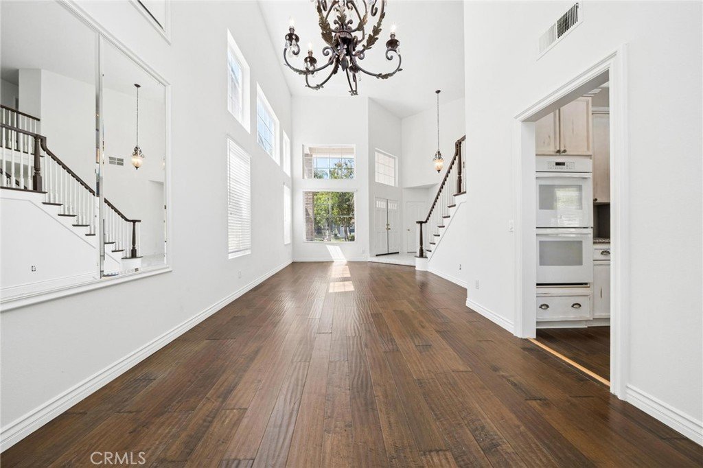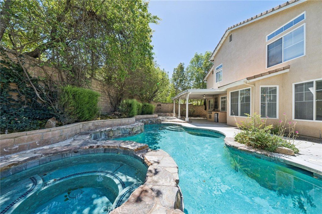 Perfect location for the Northbridge Valencia 5 bedroom pool home on a rare cul-de-sac! Open floorplan with soaring ceilings upon entry with huge super family room. The 4-car garage option from the builder was not taken - instead there is a 5th room (office/no closet) and full bath downstairs. Upstairs there are 4 good-sized bedrooms, one of which is oversized. The primary also has double walk-in closets. Fresh paint throughout and nice improvements include wood floors, wainscot/crown molding, granite counters/island in kitchen, stainless appliances, walk-in pantry and distressed cabinets. Nice yard with large, covered patio plus pool/spa and BBQ. Mature trees create privacy and the location can’t be beat! Close to parks, pools, the clubhouse and award winning Helmers Elementary (2023 Distinguished School Award) all for one low HOA and no Mello Roos taxes. This is what makes Northbridge so popular - centrally located and with amazing amenities at a low cost. Come home to Valencia!