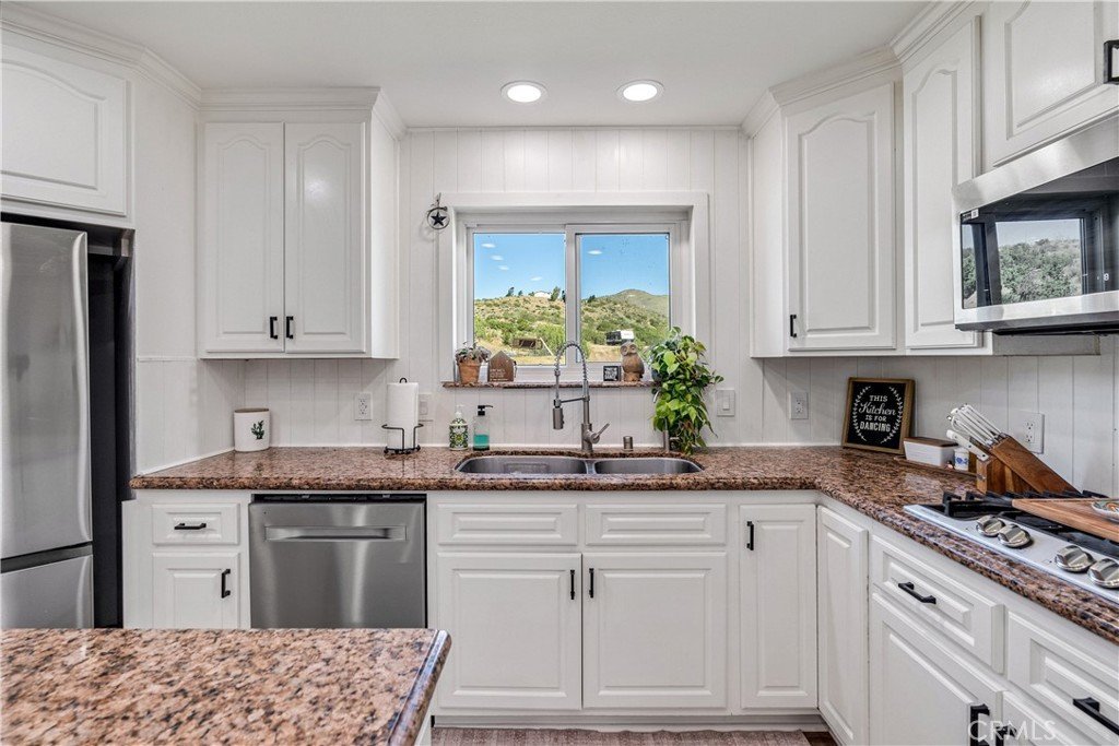 Serene 4 Bed 2 Bath Acton Home with Stunning Panoramic Views! Looking for the comfort of country living with a modern aesthetic? Look no further than this beautiful 2,193sqft home sitting on 4.95 acres and million dollar views! Entering the home, you are greeted with an open floor plan & the perfect balance of comfort and elegance with recessed lighting, beautiful flooring and the grand bay window with seating. You could spend hours seated at this window, soaking in the breathtaking views, letting stress melt away, and that is just the beginning of the comforts this home has to offer. The large living room abounds w/versatility and space for large family gatherings. Inconspicuously placed between the living room and kitchen, you will find the laundry w/tons of storage and access to your back yard. Adjacent to the living room, enjoy a cozy family room w/stunning brick fireplace and room for a pair of club chairs and couch for the family to curl up and enjoy a good read. From this comforting space, there are open sightlines to the cheerful, efficient kitchen that offers ample storage, large center island, beautiful countertops, double ovens & great view of your property. Just off the kitchen is another great space offering the opportunity for dining or bonus space w/built in shelving, storage & access to the back yard. Positioned just off the family room is a short hall that guides you the first sizable bedroom on your right, the second large bedroom on the left, at the end of the hall the third bedroom and beautiful shared bathroom w/elegant fixtures and calming tones. Rounding out the bedrooms is the primary suite w/dual closets, elegant bath w/dual sinks and large walk in shower. Outside, bask in the beautiful surroundings & endless possibilities for your 5 acres. Have horses? Need an ADU? Want to put in a Pool? Yes, yes and yes, the world is your oyster. You will also enjoy the benefits of county water, leased solar and the beauty of Acton country life