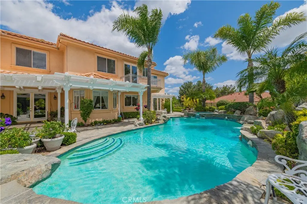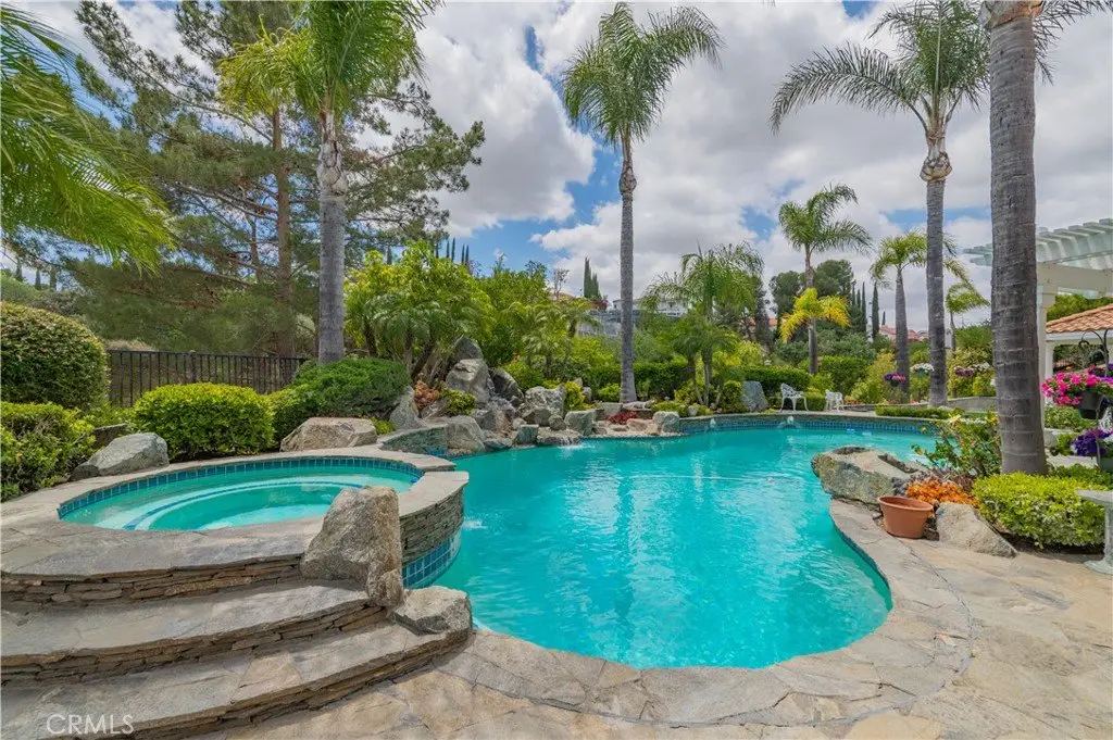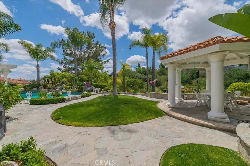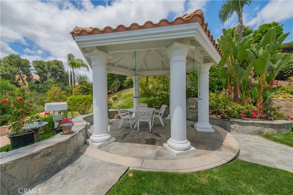 Outside, the professionally landscaped grounds are a true oasis, featuring a resort-style pool and spa, gazebo, fire pit, flagstone walkways, tastefully placed plants, flowers, and many mature trees, plus a large grassy area perfect for recreation or relaxation. A four-car garage with built-in cabinetry ensures ample parking and organized storage.