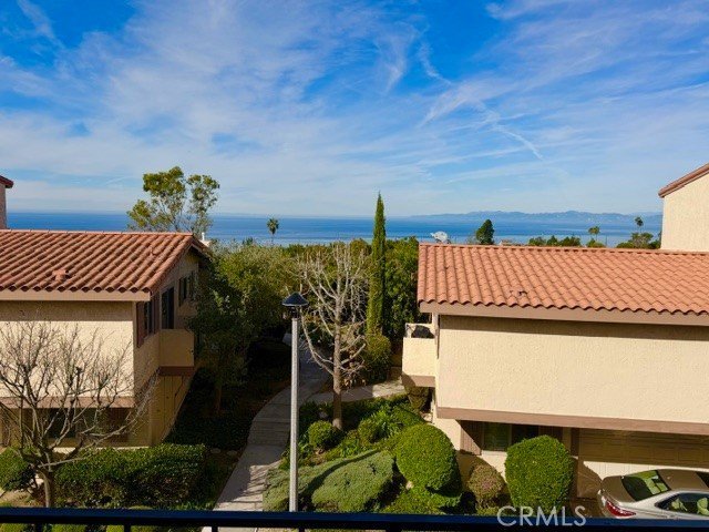 Enjoy ocean views and glorious sunsets across the sea toward Malibu and Point Dume from the spacious Primary Bedroom Suite of this lovely town home in the desirable Mira Verde complex in Rancho Palos Verdes. Enjoy the view of lush green landscaping from the Living Room and the private patio. This home, called "The Wayfarer" model by the builder, boasts 2,517 square feet of living space, it has three levels, with the entry leading to the Living Room with a gas fireplace, and lots of open Living Space beyond. An open staircase leads up to a generously-sized Primary Bedroom Suite with a gorgeous ocean view, a dressing area leading into the bathroom with dual sinks and a large walk-in closet. Two additional bedrooms overlook the gardens. The lower level has an over-sized two car garage with additional workspace, and a large bonus room that could be used for crafts, storage, home office, or as you see fit. This beautifully landscaped and guard-gated community has a Recreation Complex that includes a swimming pool, tennis court, basketball court, Pickleball court, community barbecue area and a clubhouse, and is located within the Palos Verdes Peninsula Unified School District. You'll love coming home to the Mira Verde community, and to this lovely, spacious and comfortable townhome... it's freshly painted, with new carpet, and it's ready for you to make it your new home!