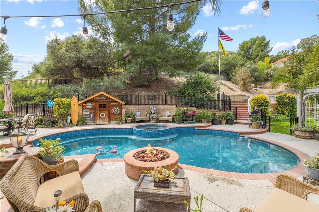 Your opportunity awaits to own an expansive, private retreat with an entertainer's dream backyard you'll never want to leave! Tucked away on a flag lot, you'll love the approach to the home with mature trees, a charming front courtyard with a stone-paver seating area, PLUS plenty of parking space for your vehicles, toys, and RV or motorhome! Inside, the home opens to a bright formal living room designed for easy gathering. The formal dining room features a stylish tray ceiling, striking chandelier, and a warm wood-plank accent wall. The kitchen offers plenty of space with warm wood cabinetry, a built-in range, granite island, backyard views, and an easy flow to the family room. Cozy up around the family room fireplace with custom built-ins, and sliding glass doors to the patio. A main-floor bedroom and full bath add flexibility for multigenerational living, guests, or a dedicated home office, plus a convenient indoor laundry room. Upstairs, the expansive primary suite offers high ceilings, a walk-in closet and a relaxing ensuite with dual vanities, soaking tub, and separate shower. Two additional bedrooms plus a full bathroom provide plenty of space, and a large loft with fireplace provides even more versatility. The backyard is made for hosting and making memories with an expansive covered patio, a raised brick planter centerpiece, multiple seating areas, and surrounded by greenery. You'll love the sparking pool and spa with hillside views, conversation fire pit, space for patio seating, and access to a built-in brick BBQ area with low maintenance turf. Perfect for outdoor dining, play, and weekend lounging. With space, privacy, and endless possibilities, this is the kind of home that feels like a lifestyle!