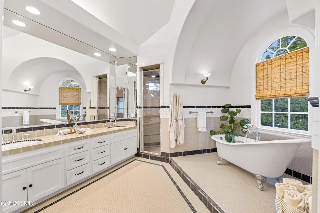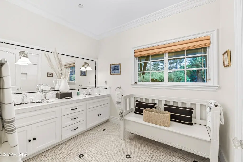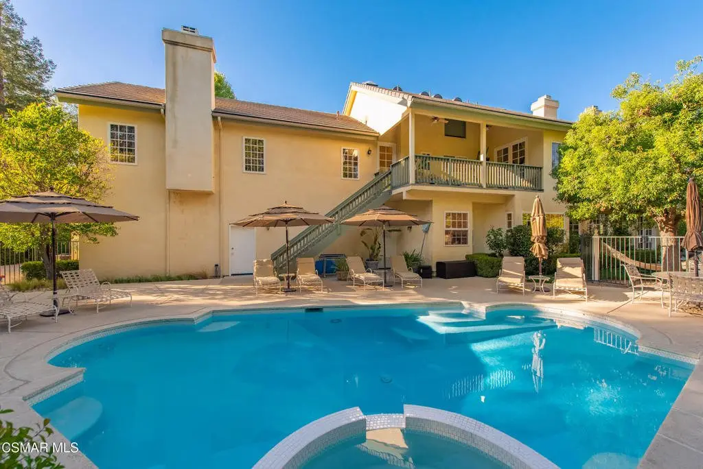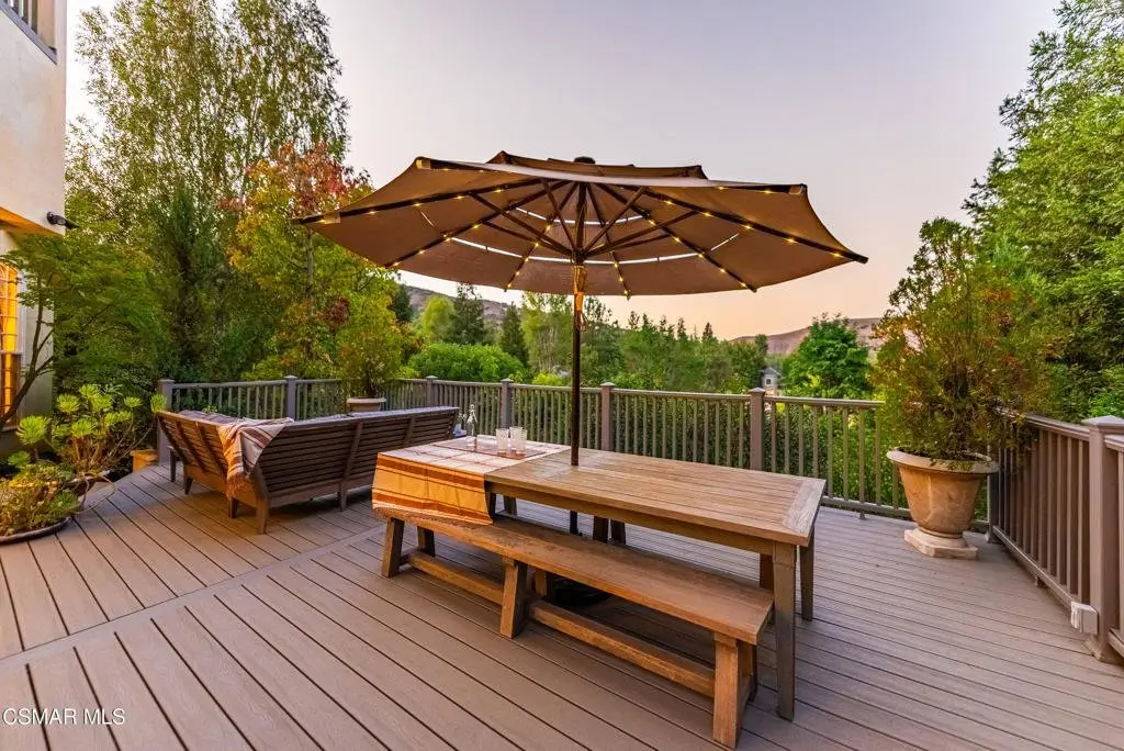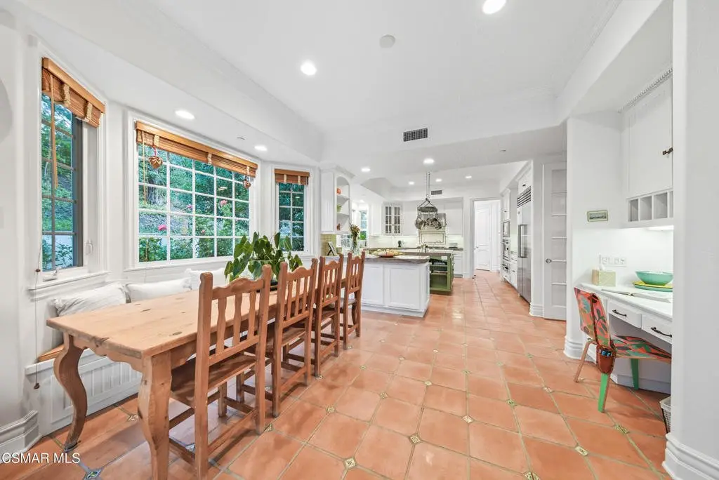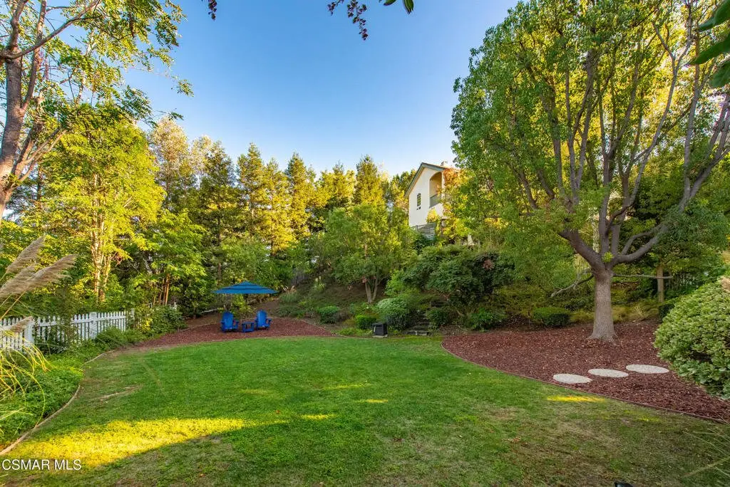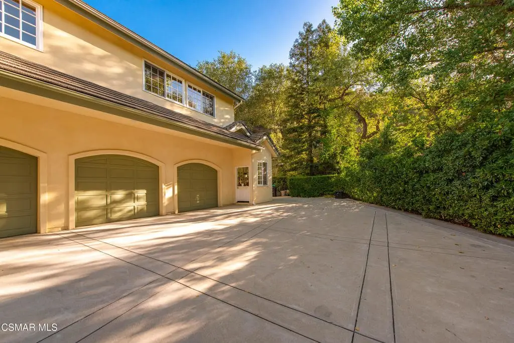 Elegant Country French Estate in Prestigious Medea Valley nestled atop a privately gated knoll. Masterfully built with the finest materials including designer tiles from famous Mission Tile Co. Sweeping mountain and valley views are the backdrop to classic elegance with modern amenities. The community security gate ensures exceptional privacy and a peaceful retreat. Upon entry, you're greeted by soaring ceilings and expansive windows in the Formal Living Room, while the spacious Dining Room features a graceful bay window ideal for entertaining. The heart of the home is the open-concept Family Room, Kitchen, and Breakfast Nook. The gourmet Kitchen includes a prep island, Viking appliances, walk-in pantry, white cabinetry, and generous counter space. The sunlit Family Room offers a built-in entertainment center, fireplace, and French doors leading to a charming patio with built-in BBQ. A downstairs Bedroom with custom office cabinetry provides a flexible workspace and a private bath. Upstairs, the luxurious Main Suite features a fireplace, sitting room with private veranda, dreamy walk-in closet, and a spa-like bath with soaking tub. French doors open to a large balcony that overlooks the pool and serene mountain vistas. Completing the upstairs are 3 additional bedrooms and two well-appointed baths plus an amazing 500 sq ft Bonus Room with fireplace and private exterior entry. The beautifully landscaped grounds include a private orchard with apple, peach, plum, and lemon trees, a pool and spa, expansive deck with beautiful views and a park-like playground. Recent upgrades include a new HVAC system and remodeled pool with new equipment.Additional highlights: Oversized three-car garage with custom cabinetry, 108 sq ft potting room/studio or storage, EV-ready with separate meter and hookup.Private community access to hiking trails in the Santa Monica Mountains Preserve and Paramount Ranch. Medea Valley Estates is just five minutes from the 101 freeway and offers convenient access to schools, fine dining, wineries, shopping, and Malibu beaches. A rare blend of privacy, luxury, and location--this custom-built estate is truly one of a kind.