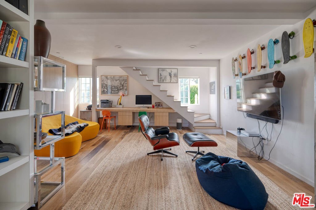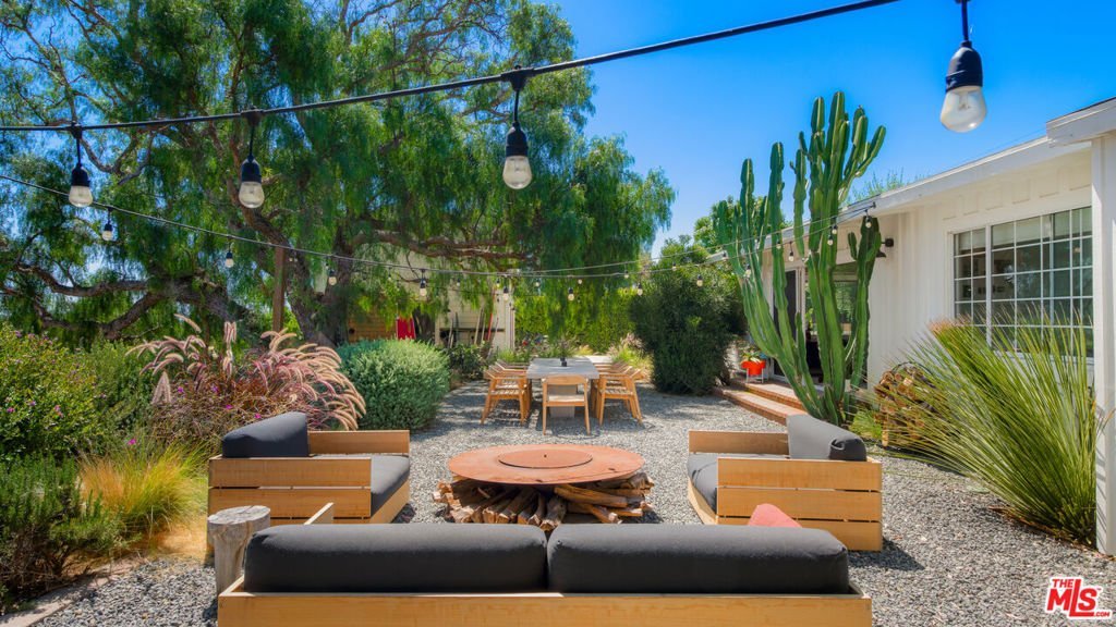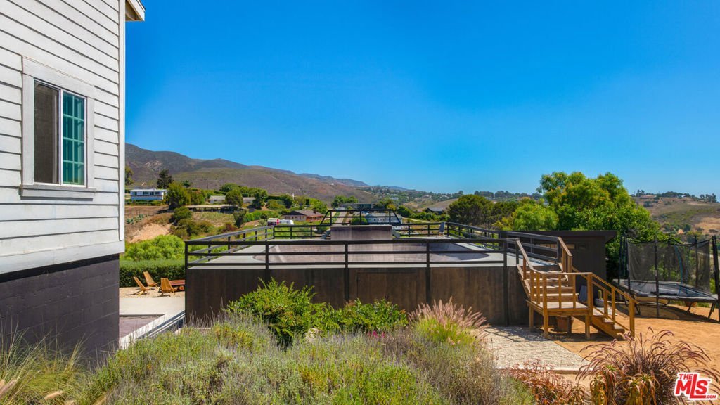 With loads of privacy, sweeping canyon and mountain views, and ample room for indoor/outdoor living and entertaining, this Malibu Park compound combines the bright, open feeling of mid-century style with a casual surf-ranch atmosphere. Located above Zuma on a gated, approximately 1.46-acre cul-de-sac lot, the property has a main house, a detached guest house, a pool house, a separate gym, a pool and spa. The single-level main house has a spacious living-dining-kitchen great room with high, beamed ceilings, wood-plank floors, a window seat, and sliding glass doors on two sides opening to gardens and patios. The kitchen has butcher-block countertops and quality appliances. Just outside is a covered patio for al fresco dining and barbecues, and a comfortable seating area around a fire pit. There's a well-established raised-bed vegetable garden, lovely flowering trees, a hammock, and string lights. The main house has three bedrooms, including a primary suite with built-ins, a walk-in closet, doors to the patio and the side yards, plus a bath with a soaking tub and large garden windows. Upstairs is a large bedroom with vaulted ceilings, a built-in desk and cupboards along two sides, a sitting area, and double-paned windows with mountain and ocean views. Near the pool house is a long swimming pool and spa with a wide sundeck for relaxing and entertaining. At the opposite end of the pool is a permitted skating bowl with sensational ocean and mountain views. Finally, there is the gym. The property is landscaped and irrigated and has on-demand hot water, a Tesla charger, new HVAC system, Fleetwood windows, security system, and generous on-site parking, and is approximately one mile from both Zuma beach and Malibu schools. Includes plans and approvals for a remodel and 900sf extension.