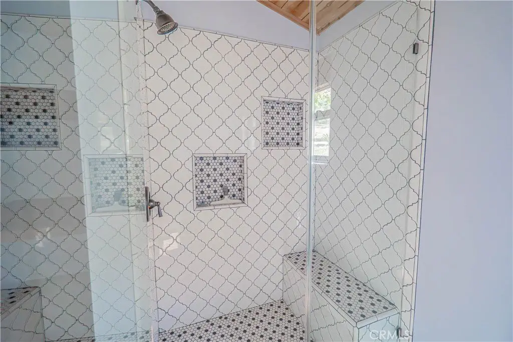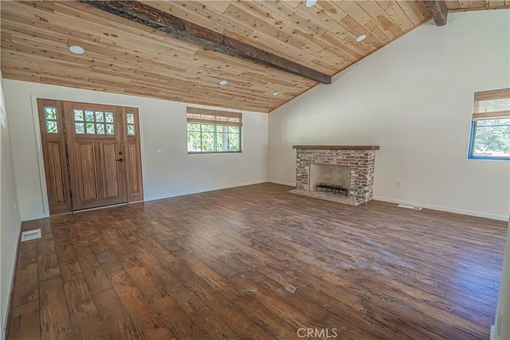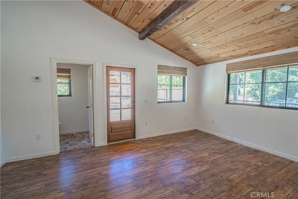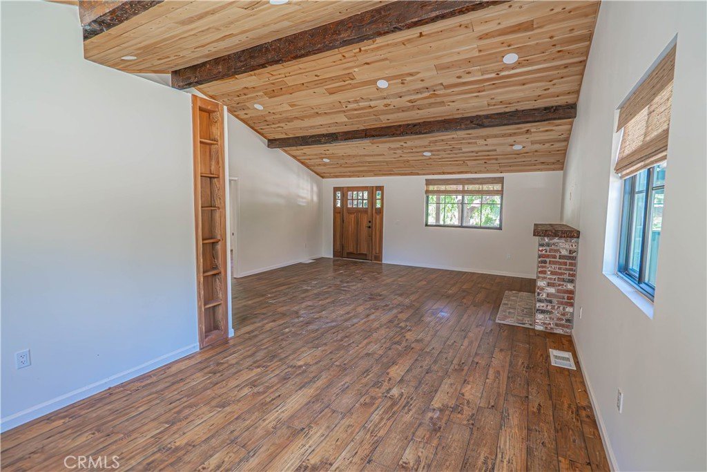 The charming 1939-built residence features 2 bedrooms and 2 bathrooms, thoughtfully updated while maintaining its rustic character. Vaulted, beamed ceilings, brick and stone accents, recessed lighting, and rich wood details lend warmth and charm throughout. The spacious living room centers around a dramatic stone fireplace, while the open-concept kitchen boasts exposed brick, stone countertops, and upgraded fixtures—ideal for entertaining and everyday living. French doors lead to wraparound porches and a large elevated deck overlooking the canyon, perfect for soaking in the surrounding views.