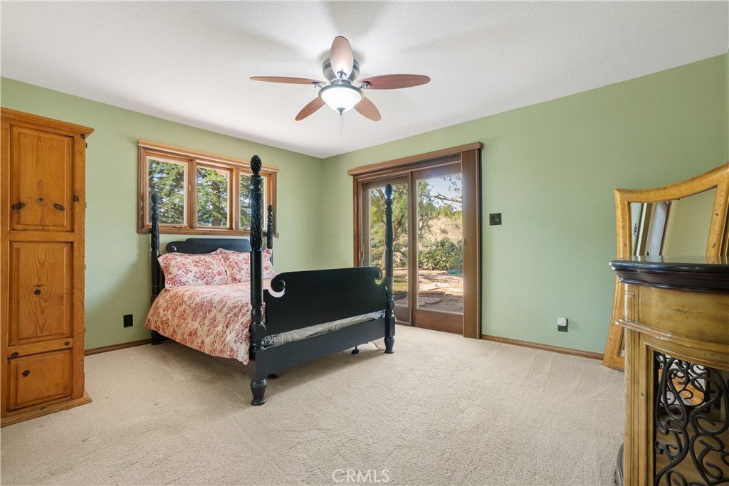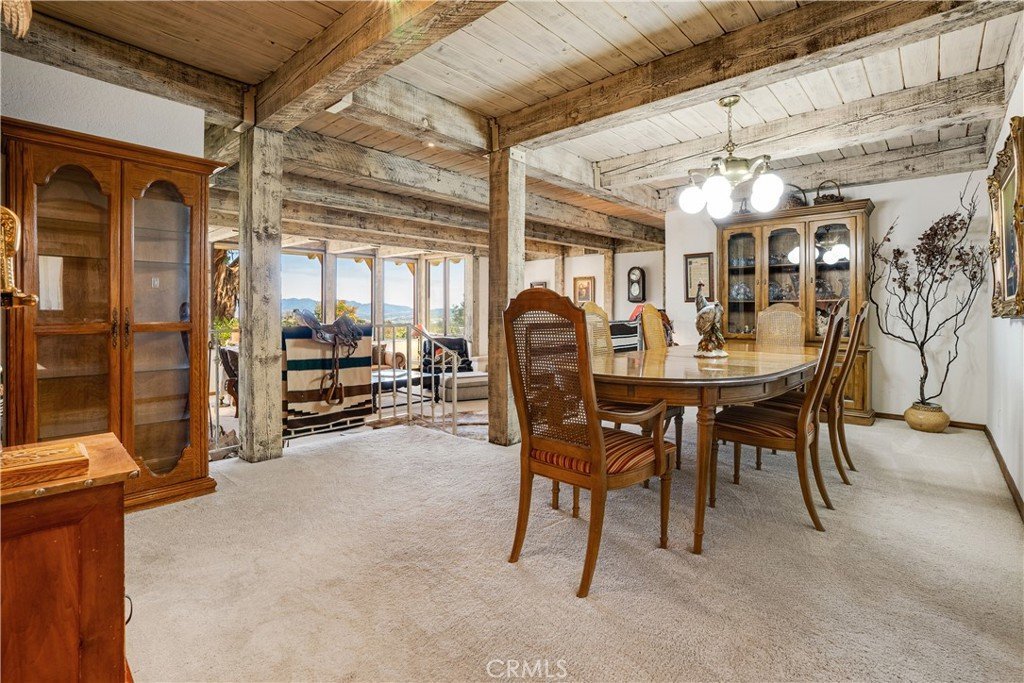 The 3,443 sq ft main residence sits atop a hill surrounded by mature trees that provide natural privacy. With outdoor access from nearly every room and a seamless connection to the landscape, the home embraces an effortless indoor-outdoor lifestyle. A wooden double-door entry opens to warm rustic interiors. The kitchen is complemented by a butler pantry, separate laundry room, and a dining room overlooking the living area below, supporting an easy flow for daily living and entertaining. The sunken living room, framed by exposed wood beams and anchored by a flagstone fireplace, opens to sweeping valley views.