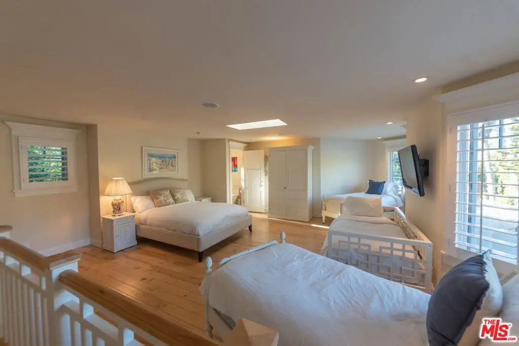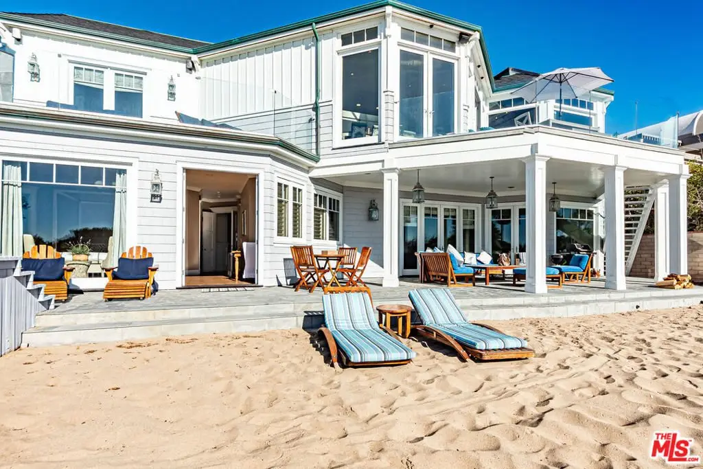 Situated on a rare 80-foot beachfront lot on Malibu's exclusive Broad Beach, this Cape Cod-style estate offers expansive ocean views and seamless indoor-outdoor living. The main residence features six bedrooms plus an office, with soaring 20-foot open-beamed ceilings, abundant natural light from skylights throughout and ocean views from most rooms. The kitchen is the centerpiece of the home, flowing into the family and dining rooms and opens to a large private ocean-view deck. The kitchen is outfitted with granite countertops, Viking appliances, three ovens, two dishwashers, and generous custom cabinetry ideal for entertaining or catering large gatherings. The house boasts two primary suites, one on each level. The main level suite includes a private oceanfront deck with an outdoor fireplace. The grand primary suite offers two custom walk-in closets and two bathrooms, one of which features a spa-like ambiance with a steam shower and a stand-alone soaking tub. Other bedrooms in the main house include an ensuite that opens to a grassy courtyard, a bedroom that opens to the beach and a full ensuite bedroom great for guests or staff. Additional amenities include a private sauna, outdoor spa, and large detached guesthouse with a full kitchen, bedroom, and 1.5 bathrooms perfect for guests and extended stays. The property also features an outdoor shower, a three-car garage, and easy access to Trancas Country Market, just a short walk away, offering dining, shopping, and more.