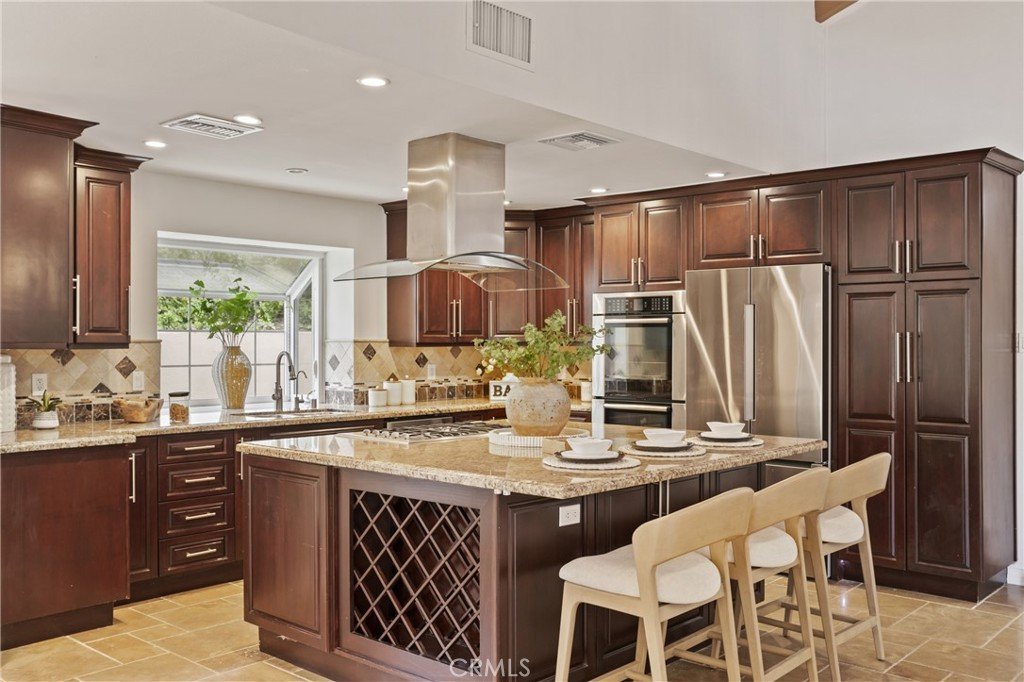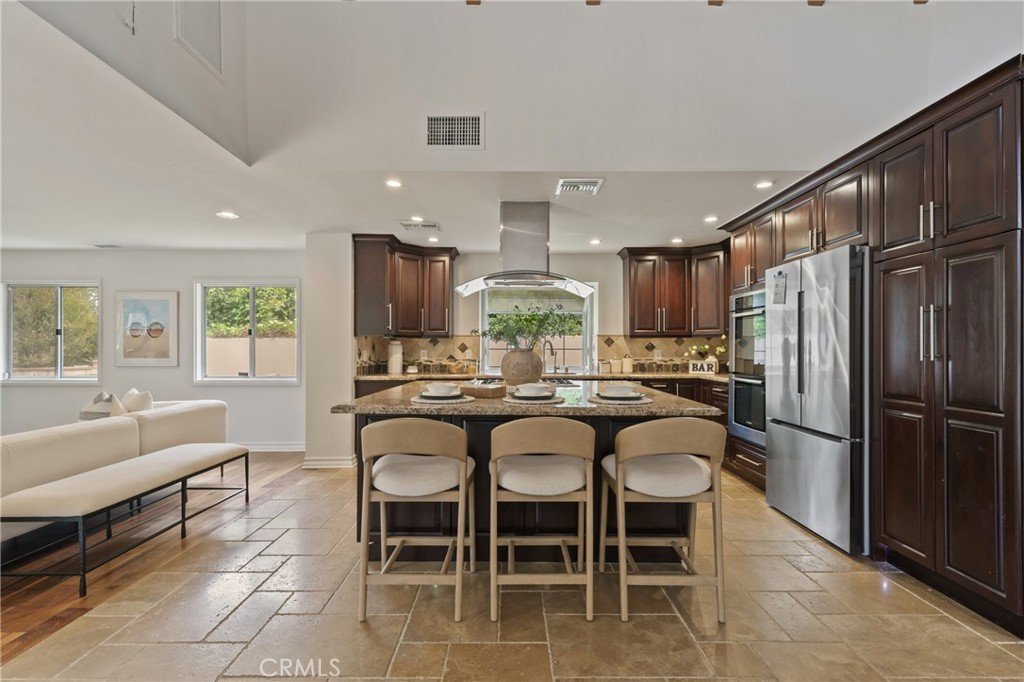 To the left, you’ll find a spacious kitchen with a center island, seamlessly connected to a vaulted-ceiling dining area featuring a beautiful fireplace. Adjacent is a cozy family room with sliding doors that open to a private courtyard—perfect for indoor-outdoor living and entertaining.
