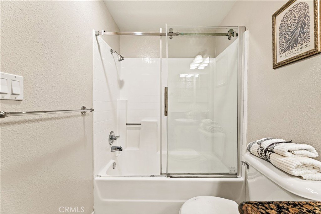 Both bedrooms feature wood flooring and operable blinds. The primary suite includes a walk-in closet and an en-suite bathroom with a granite vanity and a shower-over-tub with a framed glass enclosure. The second bedroom can be used as a home office.