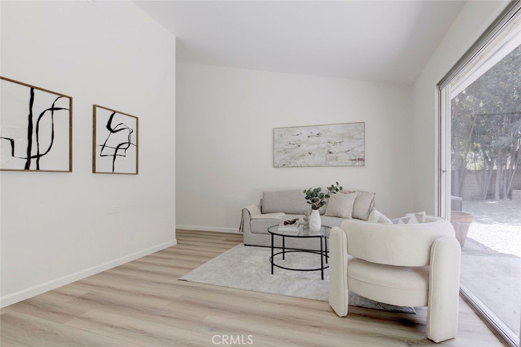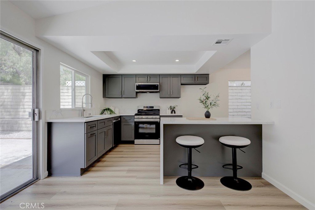 The fully renovated kitchen offers quartz countertops, soft-close cabinetry, brand-new appliances, a spacious pantry, and a cozy breakfast nook area. Just off the kitchen, an expansive family room/den opens through a large sliding glass door to the backyard, creating a seamless indoor-outdoor living experience.