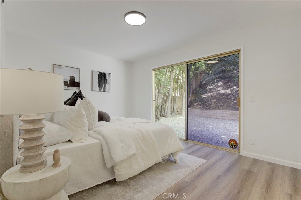 The primary suite includes a thoughtfully designed double vanity setup, with one sink and an additional dedicated space for personal use, along with a large sliding door providing direct access to the backyard. Additional highlights include updated flooring throughout, fresh interior and exterior paint, modern lighting fixtures, and upgraded bathroom vanities.