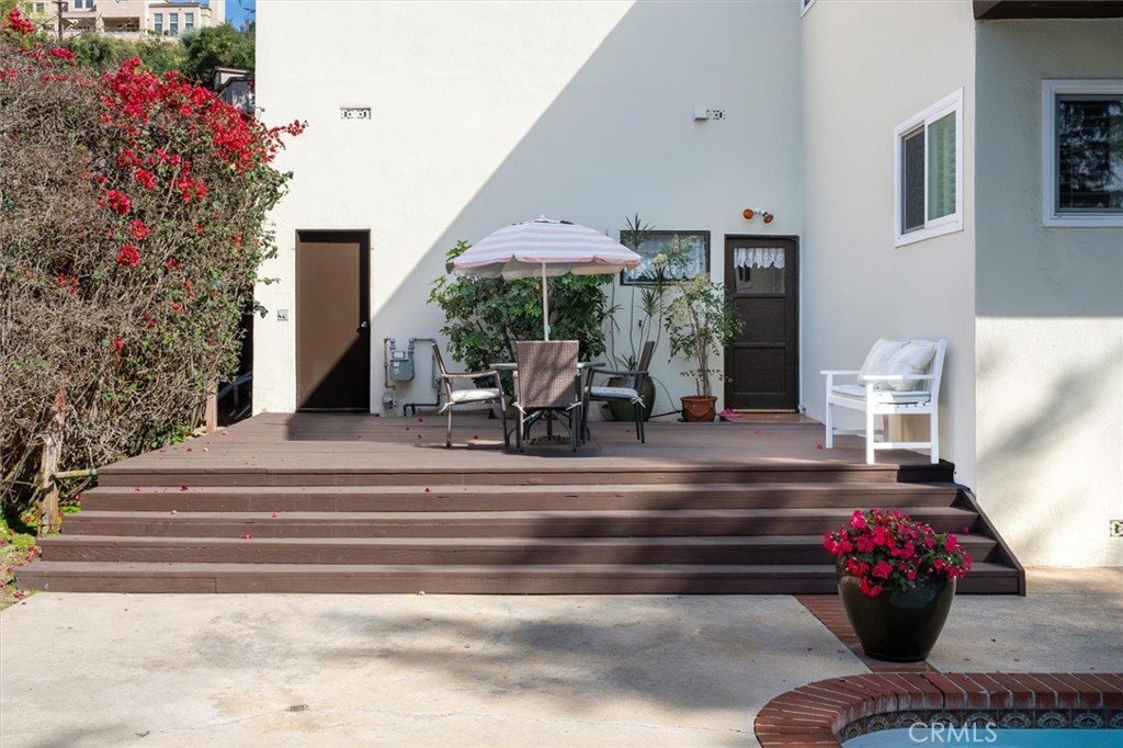 Tucked into the hills of Chevy Chase Canyon, this split-level home features an unbeatable view, an oversized pool set in an entertainer's backyard, a 2-car attached garage, and complete privacy. This home has been in the same family since 1968 and shows the kind of care that only decades of true ownership can provide. Mature trees frame the property, and the views overlooking the Glendale hills set the stage for an outdoor space that is genuinely hard to replicate. The backyard is designed for both privacy and entertaining, with a built-in BBQ, an outdoor dining area, and a brand-new hillside deck rebuilt in 2025. Tall, established landscaping creates seclusion from every angle. Inside, tile and oak flooring run through the split-level layout, with a large stone-faced fireplace anchoring the living room and a second fireplace in the downstairs suite. Multiple large dual sliding glass doors bring natural light and hillside views into the living spaces, and plantation shutters carry through every room. The downstairs bedroom opens directly to the backyard, making it a natural fit for guests or a private workspace. A 2-car attached garage connects directly to the kitchen for everyday convenience. With no HOA and only minutes away from 210 access and highly rated schools, this hillside home is the one you've been waiting for.