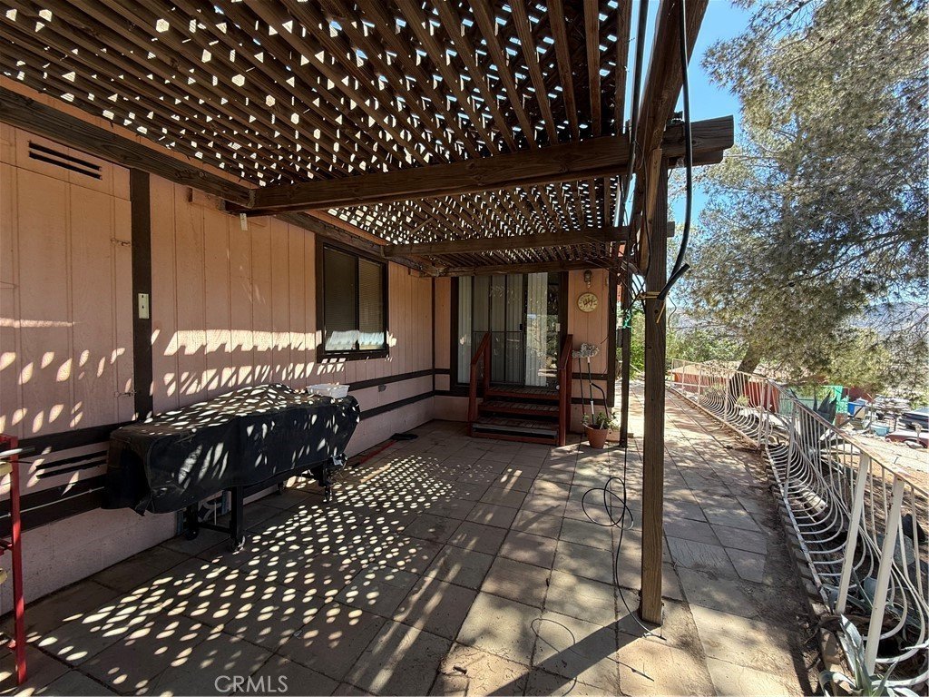The interior showcases distinctive character, highlighted by a cozy potbelly fireplace, a built-in bar ideal for entertaining, and decorative faux wood beam ceilings that bring warmth and rustic appeal. The home also features a separate laundry room for added convenience. Outdoors, an expansive back patio provides the perfect space for relaxing, hosting guests, or enjoying the surrounding views.