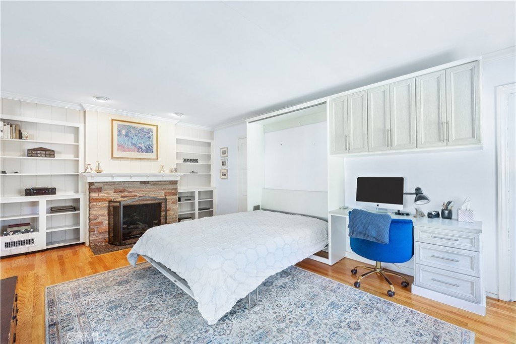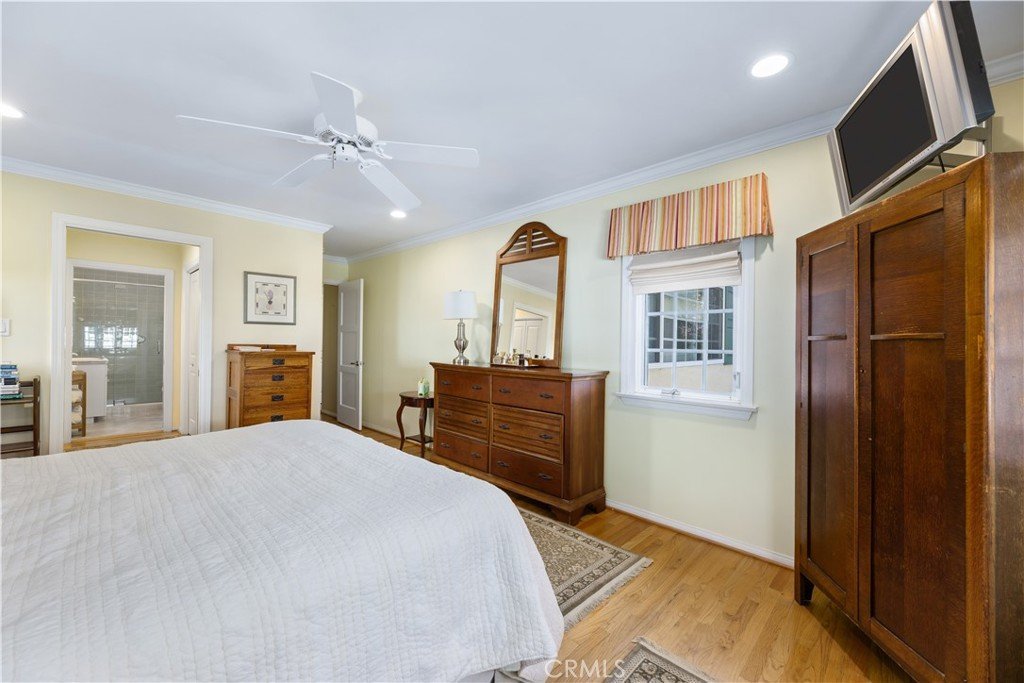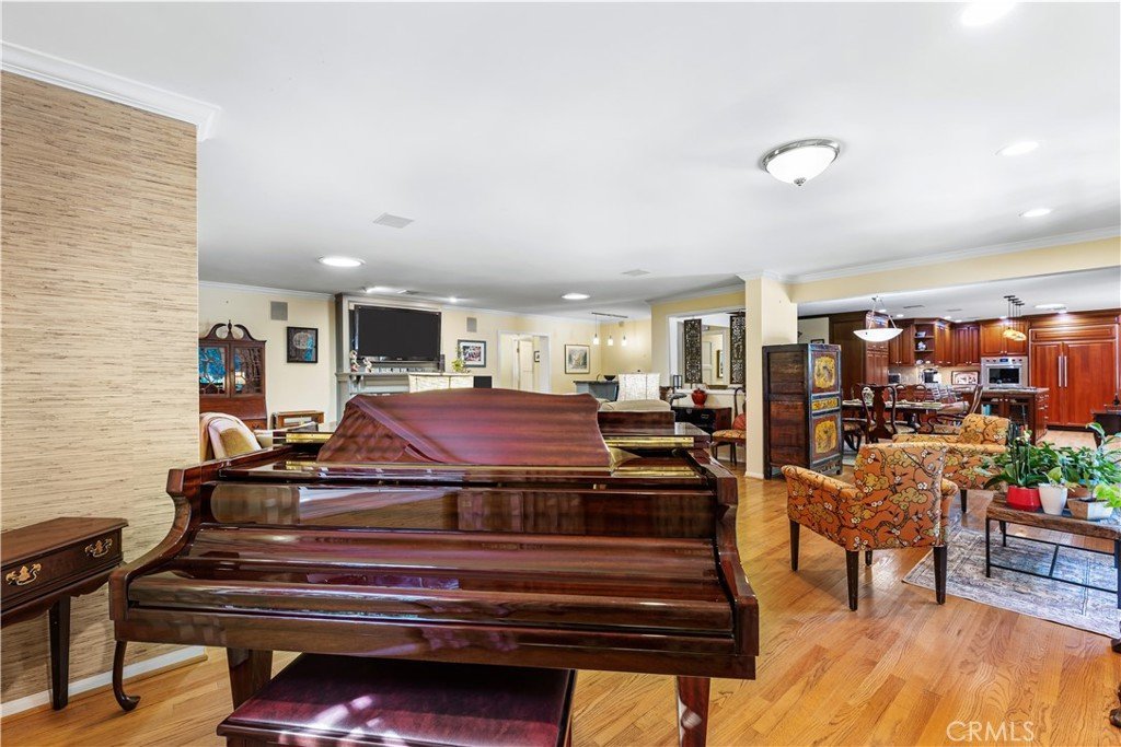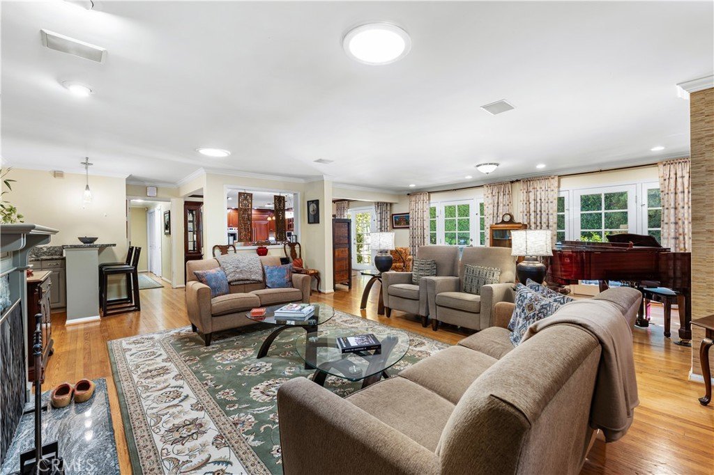 The heart of the home is an expansive living area characterized by warm wood floors, elegant crown molding, and an abundance of natural light streaming through large windows and skylights. A handsome stone fireplace serves as a focal point in the family room, creating a cozy atmosphere for gatherings, while multiple sets of French doors invite you to enjoy the seamless indoor-outdoor flow that defines the Southern California lifestyle. The gourmet kitchen is a chef's dream, boasting rich wood cabinetry, granite countertops, a large center island with integrated seating, and professional-grade stainless steel appliances including a built-in double oven and wine refrigeration.