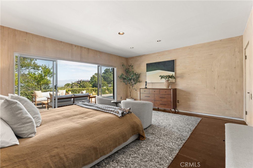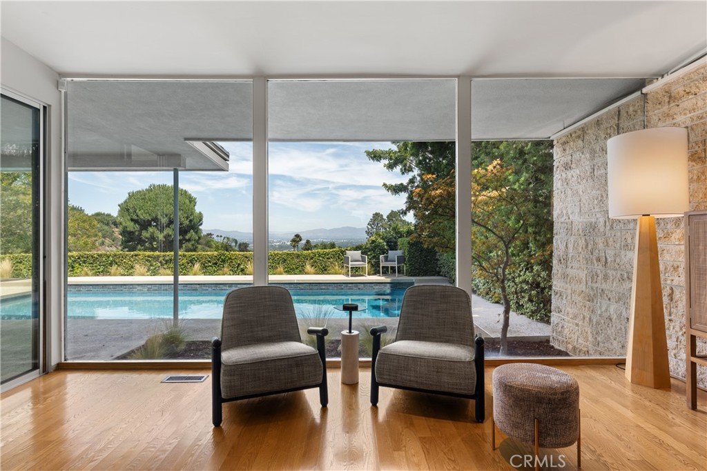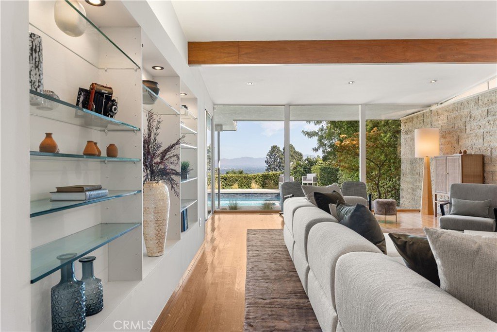 Mid-Century Modern one-story retreat located below Mulholland Drive in a breezy micro-climate with breathtaking mountain and city views. The functionality and beauty of this home is designed for easy living found in Vogue. This rare south of the Boulevard Sherman Oaks gem will delight and entertain you. Featuring 4 bedrooms plus a versatile bonus room, this home balances iconic architectural details with modern comfort. Authentic terrazzo floors welcome you into the vaulted-ceiling foyer, where clerestory windows and skylights fill the interiors with natural light. A dramatic indoor/outdoor limestone wall with a fireplace anchors the family and dining room, while wood-beamed ceilings and full-height walls of glass frame the dazzling vistas. The primary suite offers an adjacent working office, large walk-in closet and poured in place concrete spa-like bath. Three additional bedrooms and a flexible bonus room – ideal for a gym, office or playroom – provide space and privacy for every lifestyle. The kitchen retains its true Mid-Century character with solid wood cabinetry and connects to a second family room overlooking the views. An enviably large laundry room with lots of built-in cabinetry adds functionality and storage. Outside, the sparkling blue glass-tile pool (with a refreshing deep blue hue), an expansive deck and multiple lounging and dining areas create the perfect setting for entertaining or quiet evenings under the twinkling city lights. Tucked near the end of a peaceful cul-de-sac, yet just moments from Ventura Boulevard, this rare Mid-Century Modern gem combines style, function and location. Properties like this rarely become available.