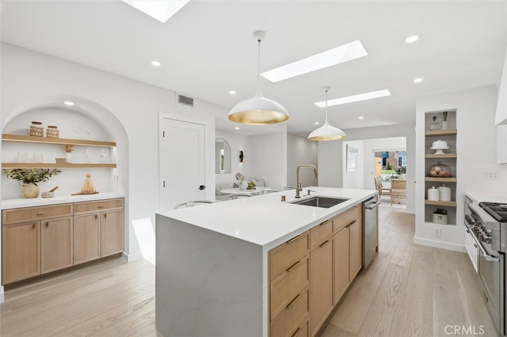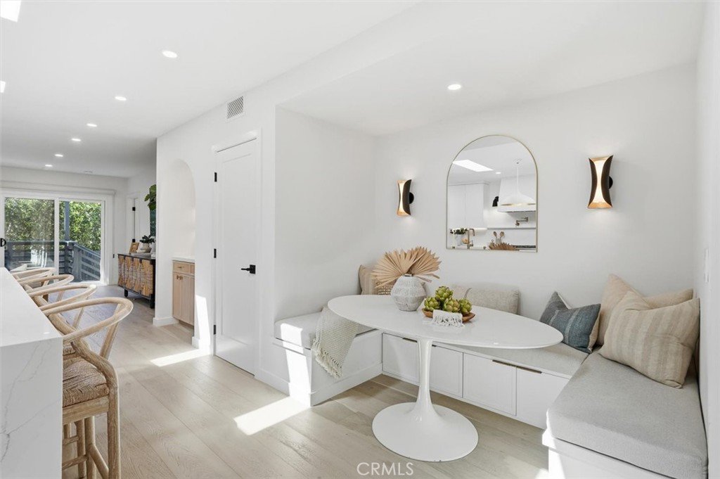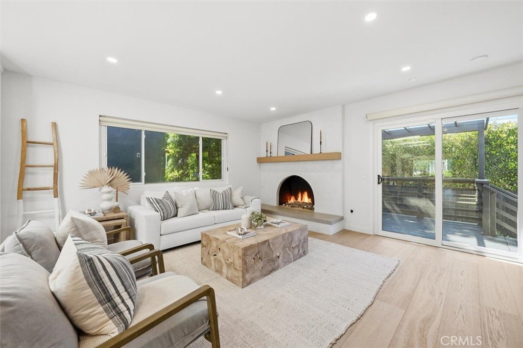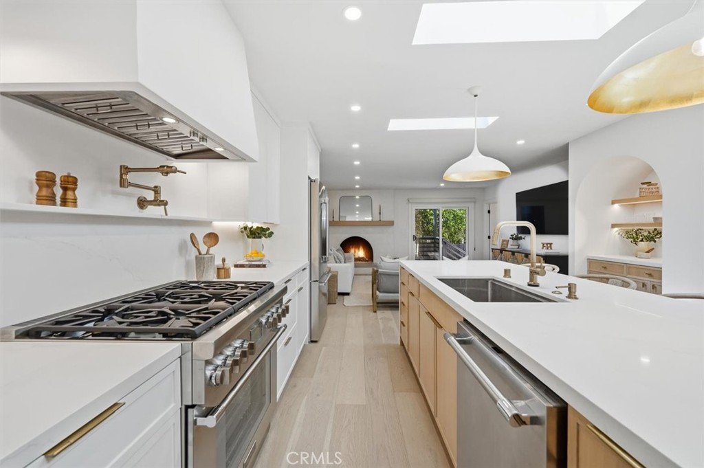 Extensively renovated with high-quality finishes throughout, the home features beautiful white oak floors, an open floor plan, and spaces designed for comfortable everyday living and relaxed entertaining. The kitchen flows seamlessly into the main living area and features Thermador appliances, generous counter space, and a custom built-in dining nook that creates a welcoming place to gather. Three skylights bring in abundant natural light, highlighting the thoughtful design and quality finishes. The living room features a fireplace that adds character and comfort to the space.