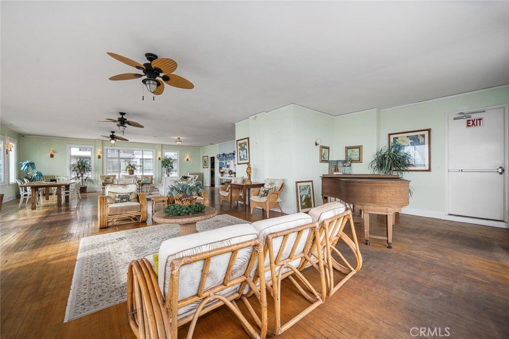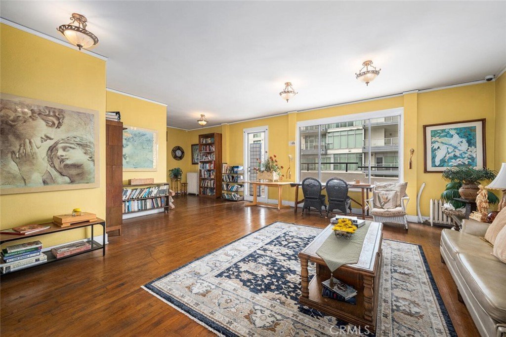The historic building welcomes residents with a grand lobby and multiple shared amenities, including community laundry, a quiet library for reading or focused work, and a large open solarium/ party room. From this expansive common area, residents enjoy sweeping Pacific Ocean views and clear sightlines to the Queen Mary.