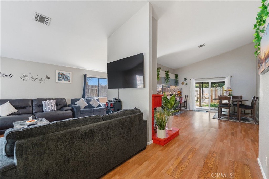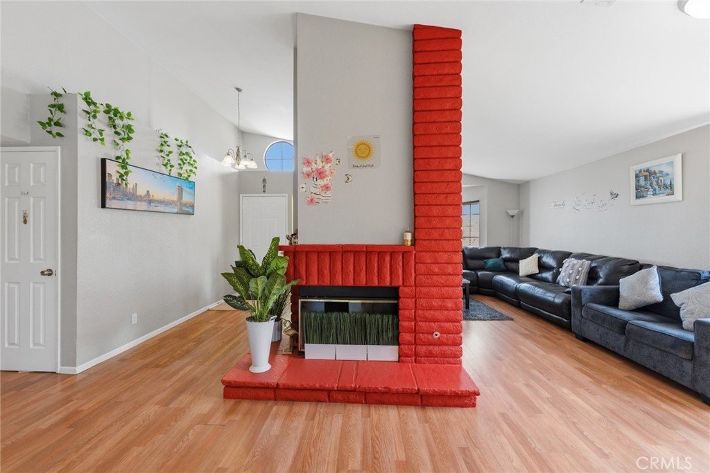 Vaulted ceilings and a floor-to-ceiling brick fireplace set the tone the moment you step through the front door of this 3-bedroom, 2-bath single-family home on Dawson Drive. The living room is generous in scale, filled with natural light, and anchored by that statement fireplace, the kind of architectural detail that gives a home real character.