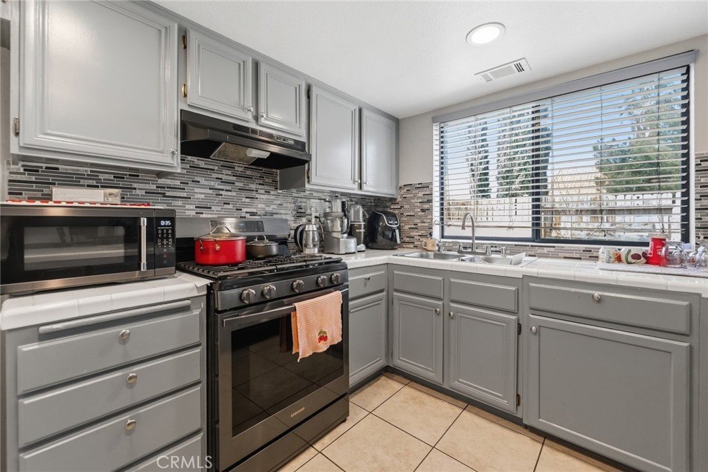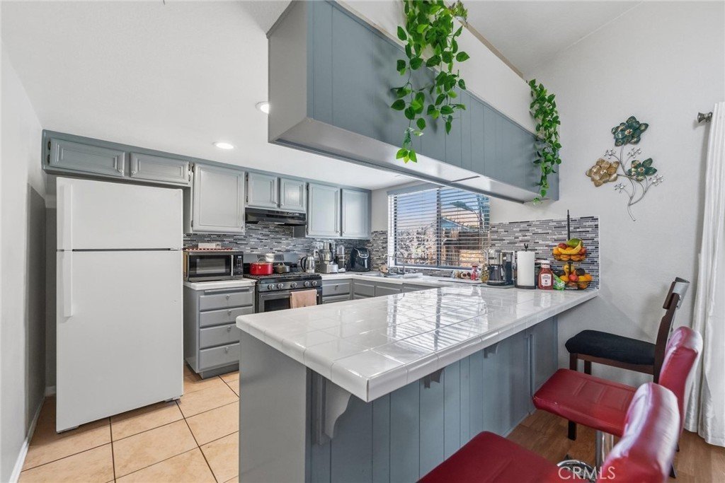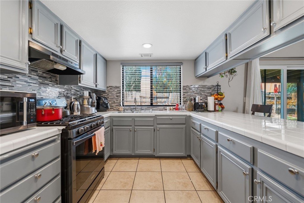 Hardwood-style flooring runs through the main living areas and all three bedrooms, creating a cohesive, warm feel throughout. The kitchen features updated slate-blue cabinetry, a decorative tile mosaic backsplash, a gas range, and tile flooring functional and thoughtfully finished. A dedicated indoor laundry room with built-in shelving keeps daily living organized and efficient.