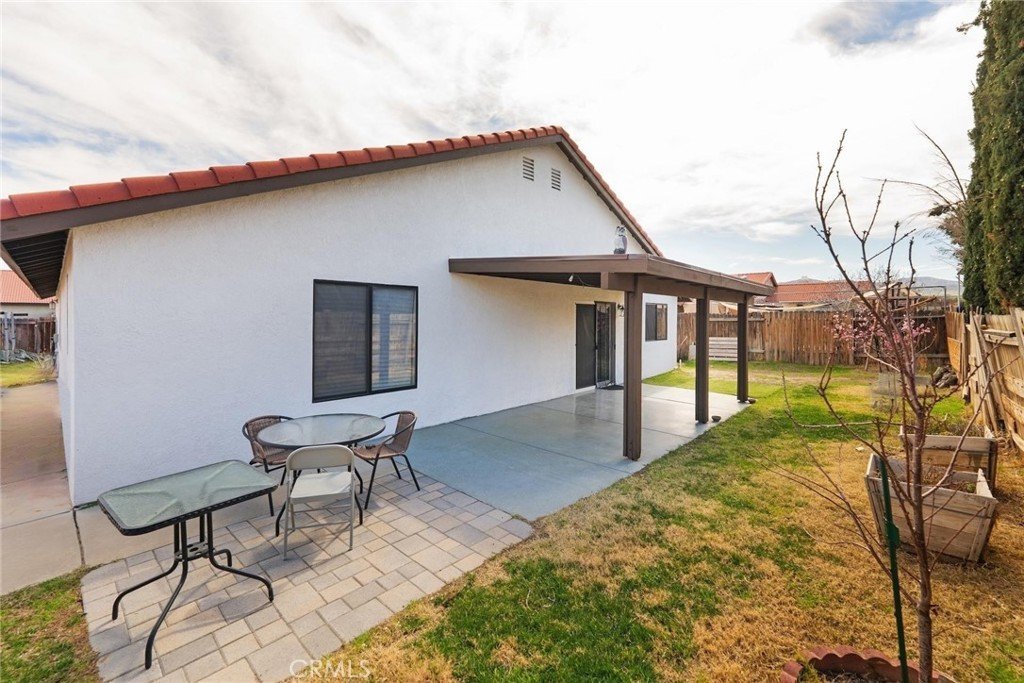 Out back, the yard is set up for real outdoor living. A covered pergola patio with pavers creates a defined space for dining or relaxing, while the wood-fenced yard offers privacy and room to spread out. A concrete side yard runs the full length of the property, adding additional usable space.