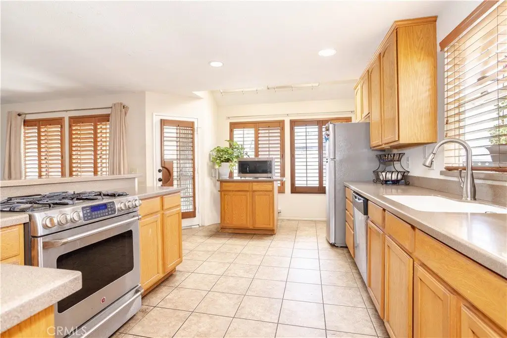 plantation shutters, and an aesthetic blend of veneer hardwood, tile, and carpet flooring. The spacious living room is bathed in natural light from multitude of windows which highlights the vaulted ceiling with lighted fan, and has a mantled gas-burning brick fireplace. The family’s cook is going to appreciate the kitchen’s abundant cabinets, ample quartz counters, built-in stainless steel appliances, and the convenience of the