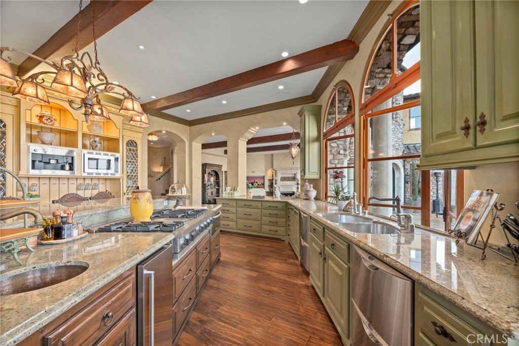 • Interior Features: BeamedCeilings, WetBar, BuiltInFeatures, BrickWalls, Balcony, DryBar, CofferedCeilings, SeparateFormalDiningRoom, EatInKitchen, Elevator, HighCeilings, Intercom, InLawFloorplan, LivingRoomDeckAttached, MultipleStaircases, OpenFloorplan, Pantry, StoneCounters, RecessedLighting, TwoStoryCeilings, WiredForData