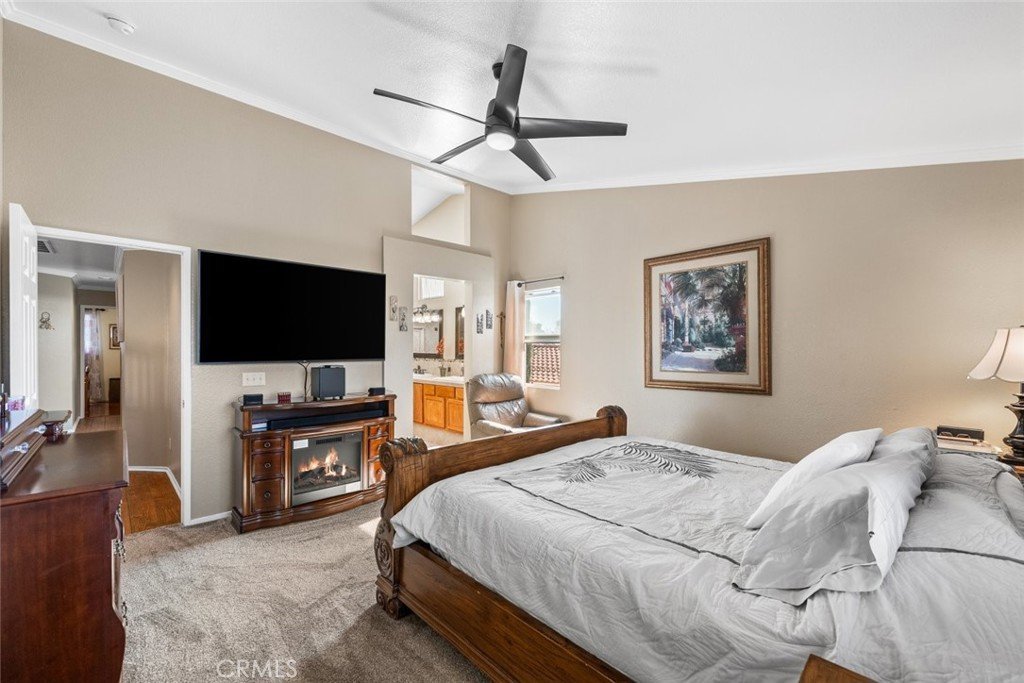 Inside an inviting living room featuring high ceilings, abundant natural light, and a cozy fireplace, perfect for relaxing or entertaining. The kitchen and dining areas flow seamlessly into the living space, enhancing the open-concept feel.