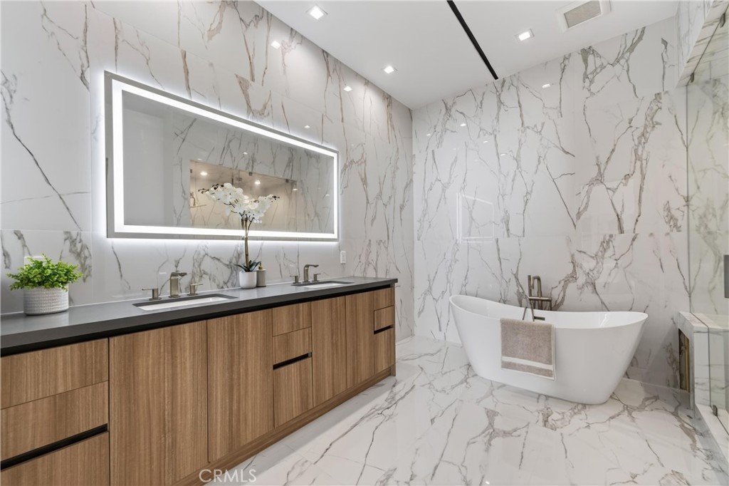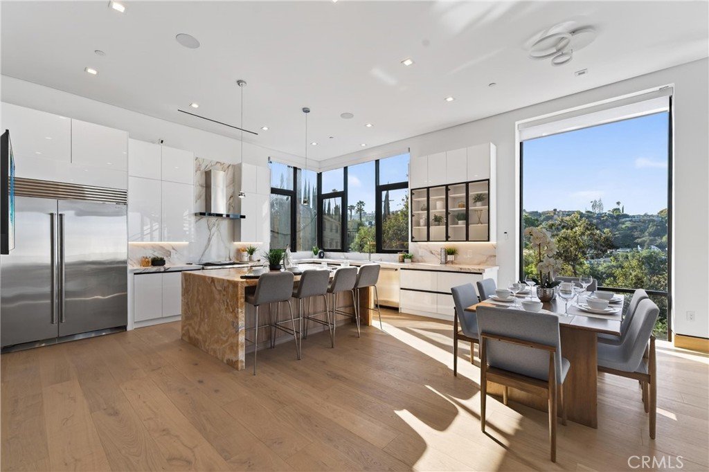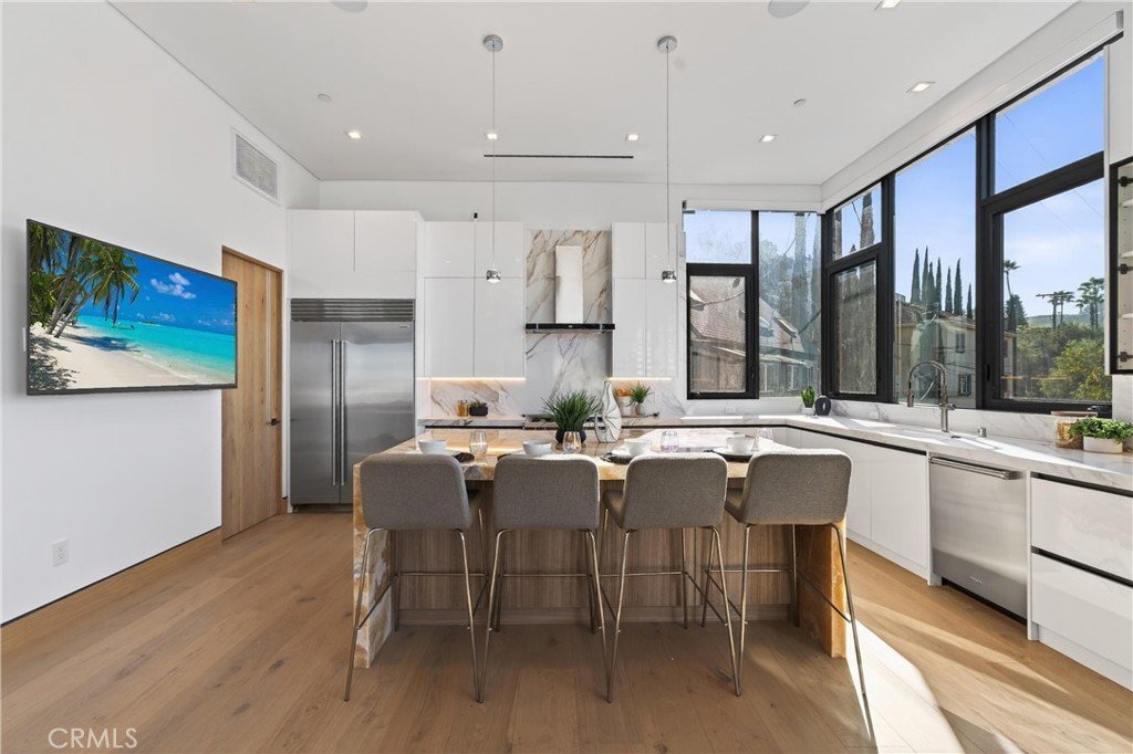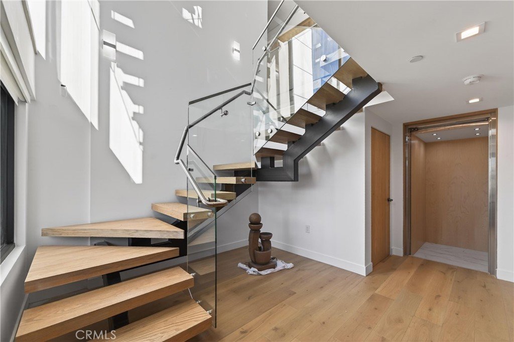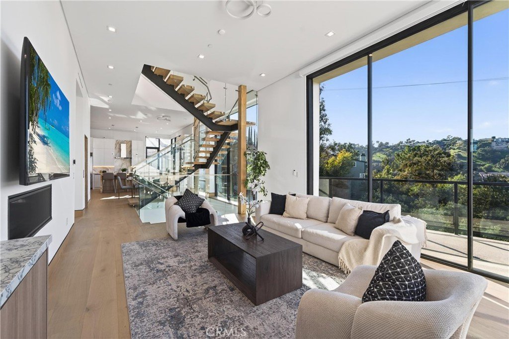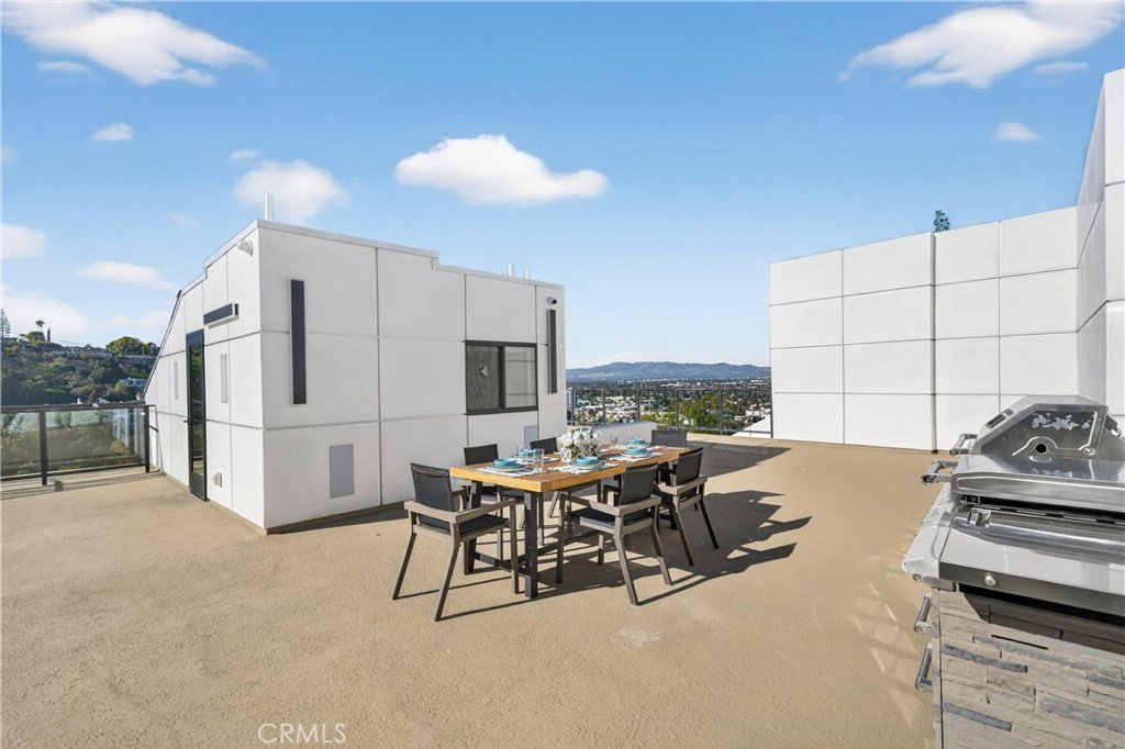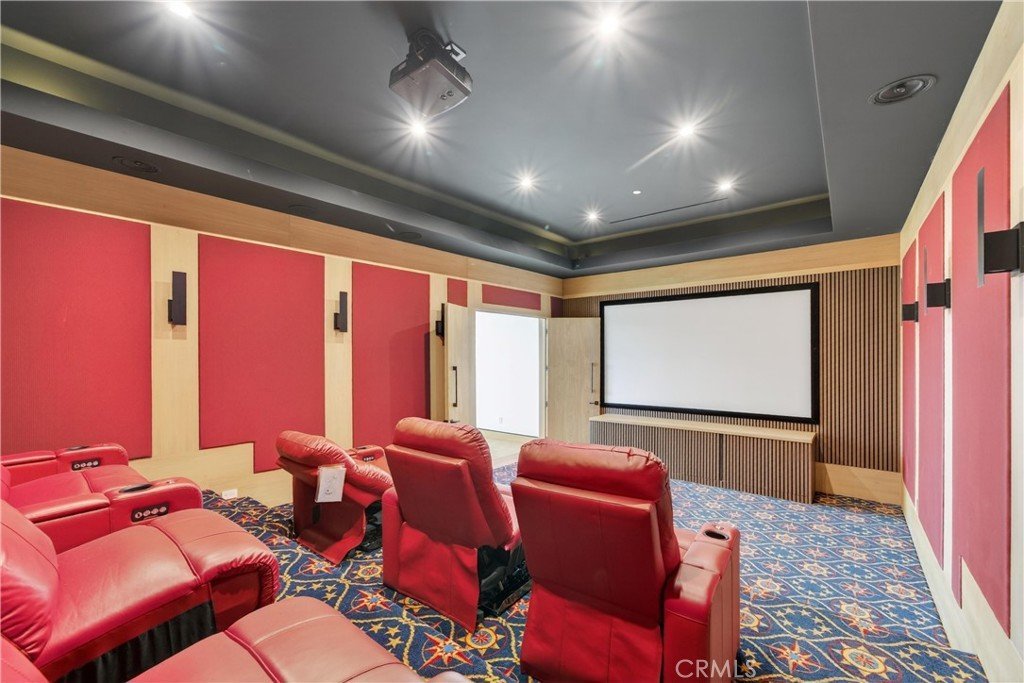 Welcome to 4016 Oakfield Drive, a gravitating 2025 new-construction residence located in the highly sought Sherman Oaks hills. This striking modern estate showcases bold architectural design, fully-renovated finishes, and sweeping skyline views lapsing around the perimeter of the property. This multi-level residence offers four bedrooms, four bathrooms, a full chef’s kitchen with dining area, a private movie theater, a fully-equipped rooftop entertaining deck, and a three-car garage, delivering a true luxury lifestyle. Prior to entry, the exterior offers a striking statement with clean geometric lines, floor-to-r-to-ceiling glass, and a sophisticated blend of concrete, metal, and warm wood accents. Inside, the home opens to a light-filled interior anchored by wide-plank wood flooring and a dramatic floating staircase with glass railings connecting each level. The first level leads to the garage and is adjacent to the elevator reaching any and all desired floors. The second level houses three expansive bedrooms, two bathrooms, and amiable custom storage. The third level of the residence greets you with an open-concept main living space featuring the main living room, ultimate chef’s kitchen, custom bar, primary master suite, secondary master suite, a private movie theater, and an expansive patio overseeing the valley of Los Angeles. The chef’s kitchen is elegant and functional, centered around a statement waterfall-edge stone island with bar seating. Custom flat-panel cabinetry, premium built-in appliances, full sink, and polished stone countertops create a clean atmosphere. The dining area is directly adjacent to the kitchen making it convenient for hosting dinners and centered in the heart of the home. Designed for entertainment and hosting, the home features a dedicated movie theater with tiered seating, sound-treated walls, and integrated lighting perfect for private screenings or viewing experiences. A custom bar is located with a mini fridge and marble cabinetry ideal for storing all entertainment essentials. The living room also features a striking double-sided linear fireplace anchors the home, connecting the living room and the primary suite with ambiance. House has a central vacuum system Leading the way to the final floor, the rooftop deck provides a private outdoor oasis complete with a built-in stainless steel barbecue, prep space, and ample room for dining and lounging, all set against panoramic skyline views.