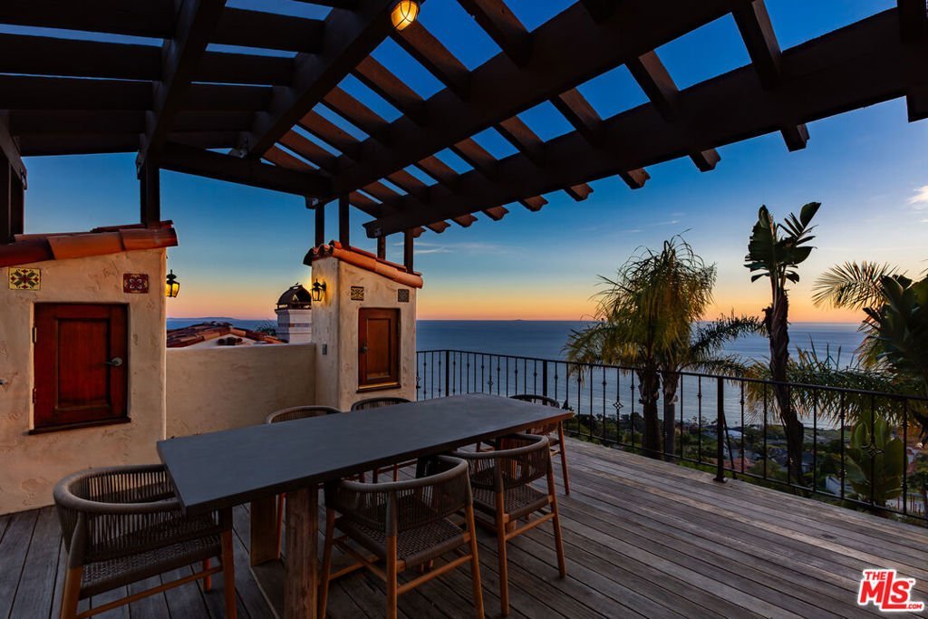 Experience sweeping, panoramic views of the azure blue ocean from this coastal retreat in western Malibu, perched above world-famous beaches and just moments to the Trancas Country Market, Zuma Beach, Leo Carillo, and prime surfing at County Line. Giant picture windows frame striking vistas from every room, and beautiful stained glass perfectly captures natural light for added color and pop. The formal living room features lofty double-height vaulted ceilings, with French doors opening to viewing decks and sunny balconies. Wide-plank oak floors flow throughout the home's entertaining spaces. The custom kitchen is fitted with copious cabinetry, top-of-the-line appliances, center island with serving ledge and breakfast bar seating, and recipe desk as clerestory windows offer garden and ridge line views. Nearby, the formal dining room is appointed with a built-in china cabinet and serving bar. Upstairs, discover a loft-style pajama room and lounge for relaxing and conversation with family and friends. The large primary suite has private balcony access, fireplace, sitting area, and a series of windows framing blue skies and gorgeous sunsets over the Pacific. There is a walk-in closet and a spa-inspired bath with a jetted tub, glass shower, and dual-sink vanity as well as an office with built-ins. Outside, enjoy numerous spaces to lounge and dine al-fresco amidst soothing ocean breezes. Above the three-car garage is also an ADU/guest quarters with exposed beams, full kitchen, and private viewing terrace. A large motor court affords parking for a number of cars, and a long gated driveway adds privacy and security. Relish a new way of life from this fresh vantage point with views that stretch from Catalina to the Channel Islands. Venture up scenic Pacific Coast Highway to Point Mugu, spend the weekend wine tasting in Santa Barbara, bike, explore hiking trails, or commute to Santa Monica and the Westside. Central to so many destinations and recreational possibilities, this truly is paradise found.