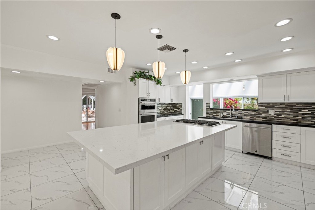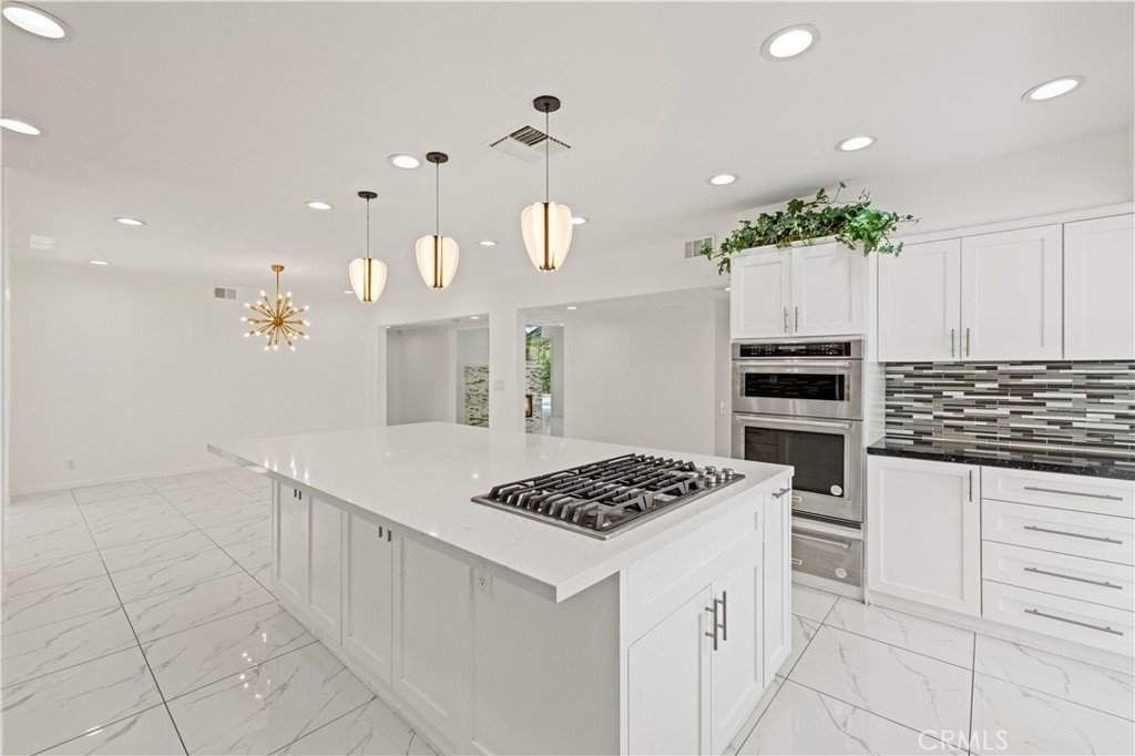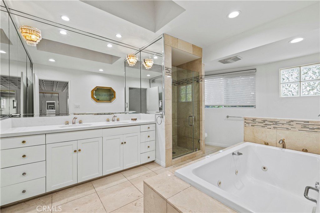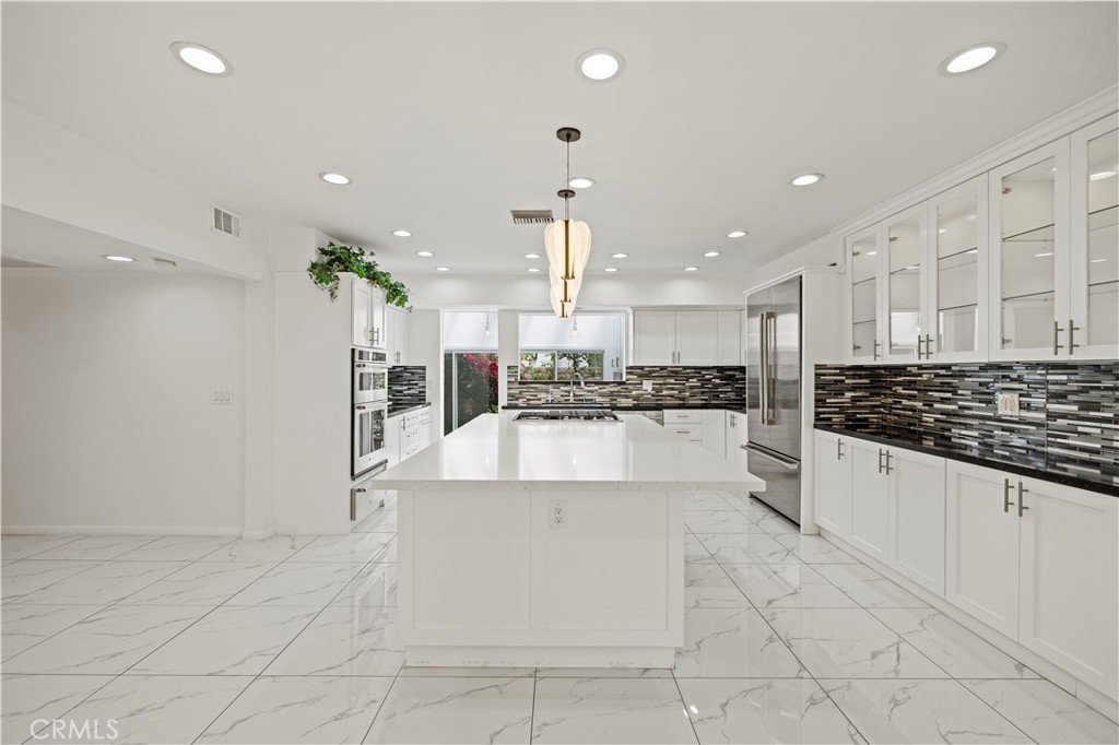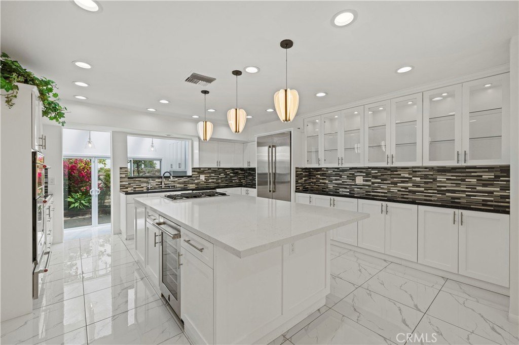 Step outside to an entertainer’s backyard oasis featuring a sparkling swimming pool, relaxing hot tub, built-in outdoor kitchen with BBQ, and multiple seating areas perfect for enjoying the Southern California lifestyle.