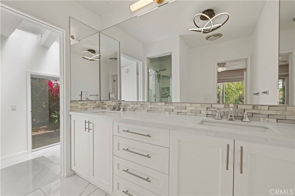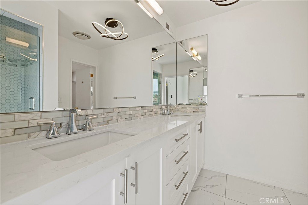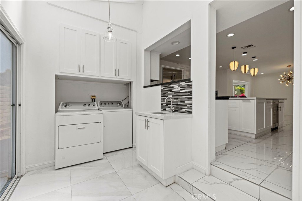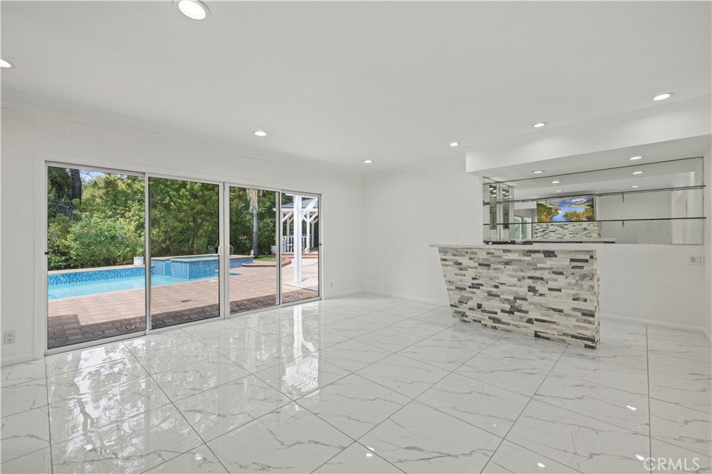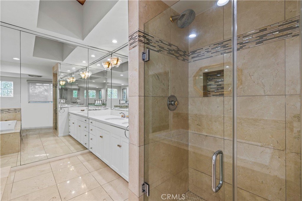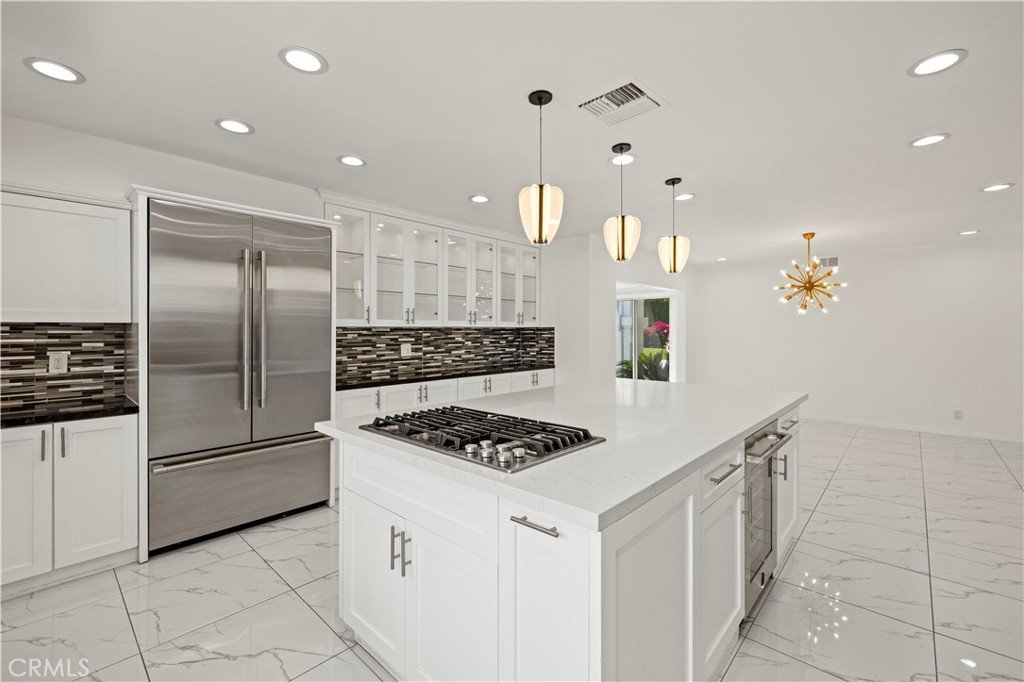 Step outside to an entertainer’s backyard oasis featuring a sparkling swimming pool, relaxing hot tub, built-in outdoor kitchen with BBQ, and multiple seating areas perfect for enjoying the Southern California lifestyle.