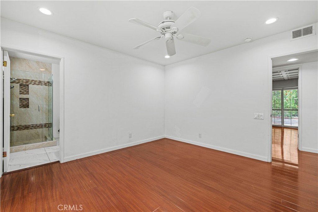 The primary suite serves as a private sanctuary, featuring expansive windows, high-end finishes, and a spa-inspired bathroom complete with a soaking tub, walk-in shower, and dual vanities.