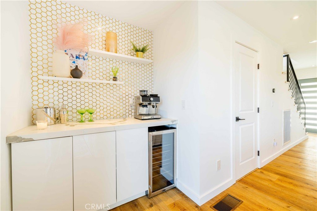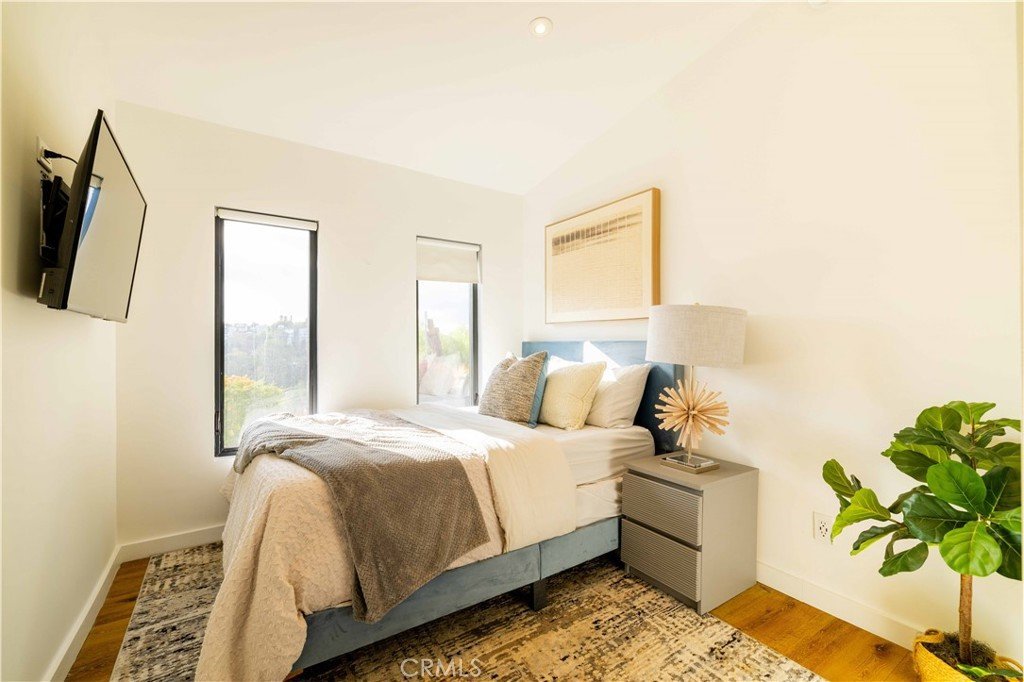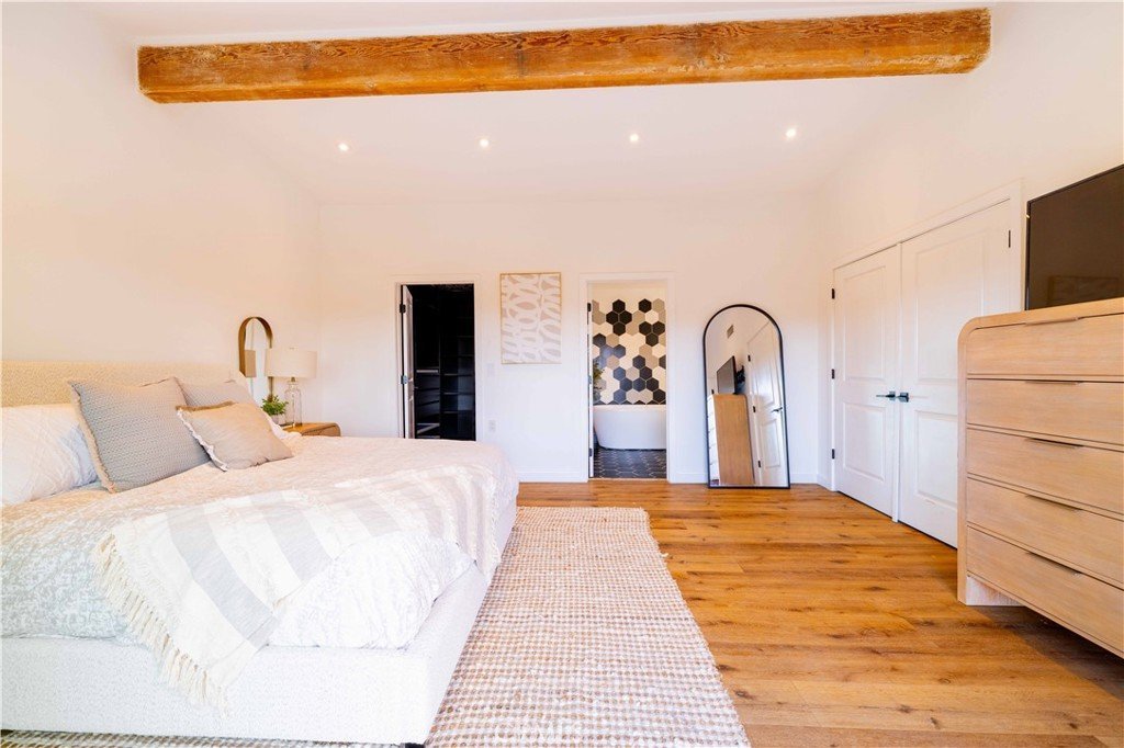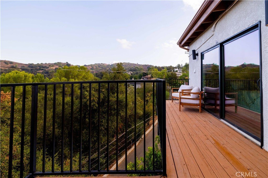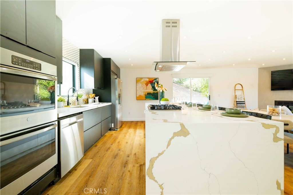 Set above the surrounding landscape with sweeping views of the Santa Monica Mountains, this thoughtfully redesigned Woodland Hills home blends architectural character with modern sophistication.
