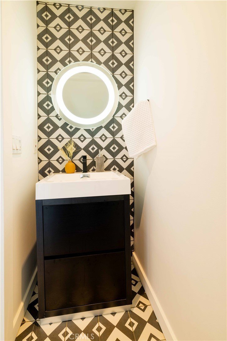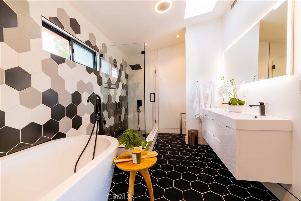The primary suite serves as a private retreat, featuring a spacious walk-in closet with custom built-ins and skylight, plus a spa-inspired bath with hexagon tile flooring, floating dual vanity, oversized walk-in shower, and standalone soaking tub. LED backlit mirrors enhance all bathrooms. Energy-efficient split-system HVAC provides year-round comfort.